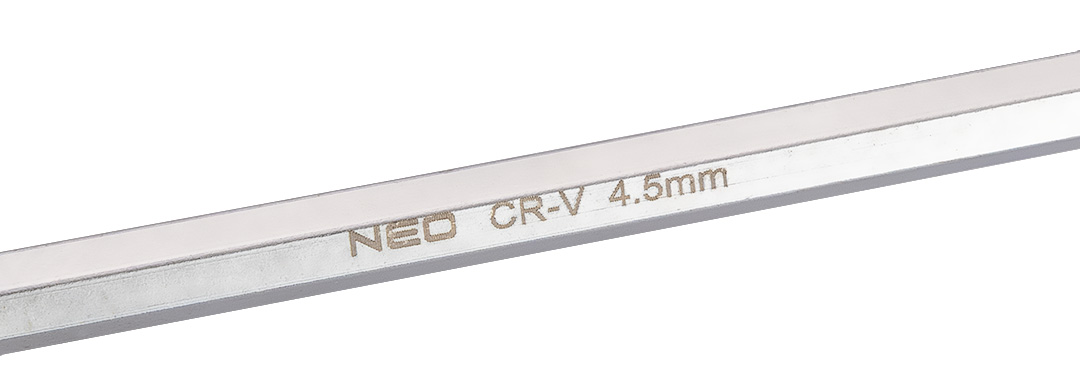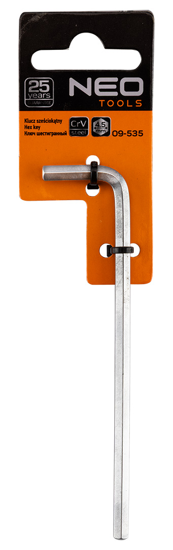 Klucz sześciokątny NEO (nr ref. 09-535) o wymiarze 4.5 mm, długość 108 mm. Wysokogatunkowa stal chromowo-wanadowa zapewnia długoletnią wytrzymałość klucza. Niezawodność produktu potwierdza 25-letnia gwarancja. Marka NEO spełnia oczekiwania profesjonalistów.
