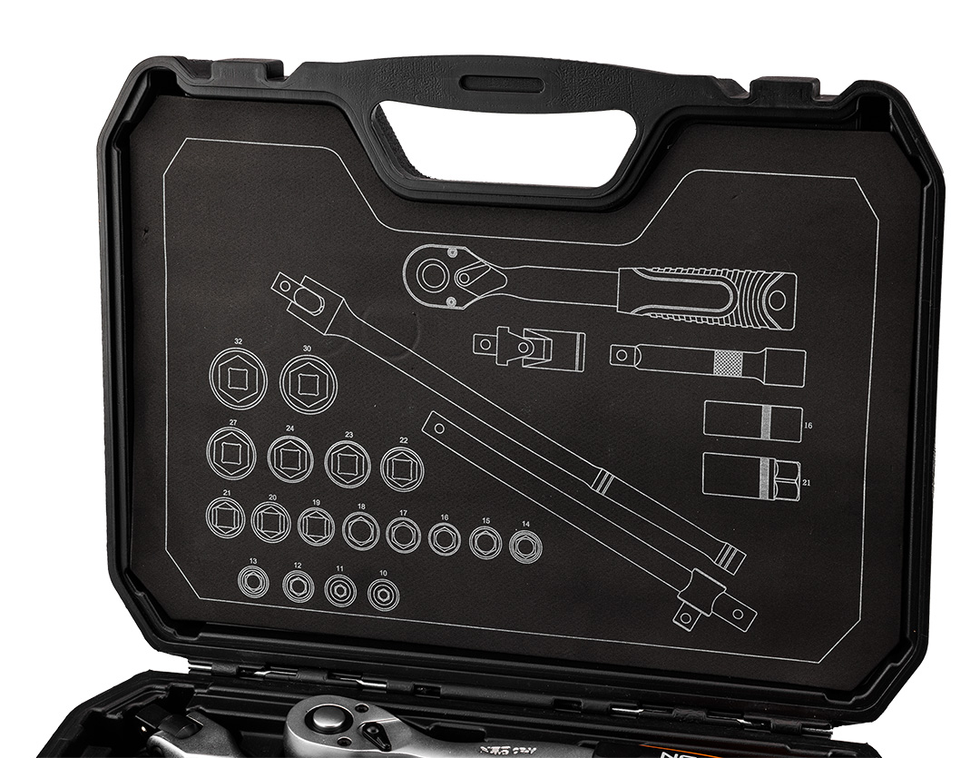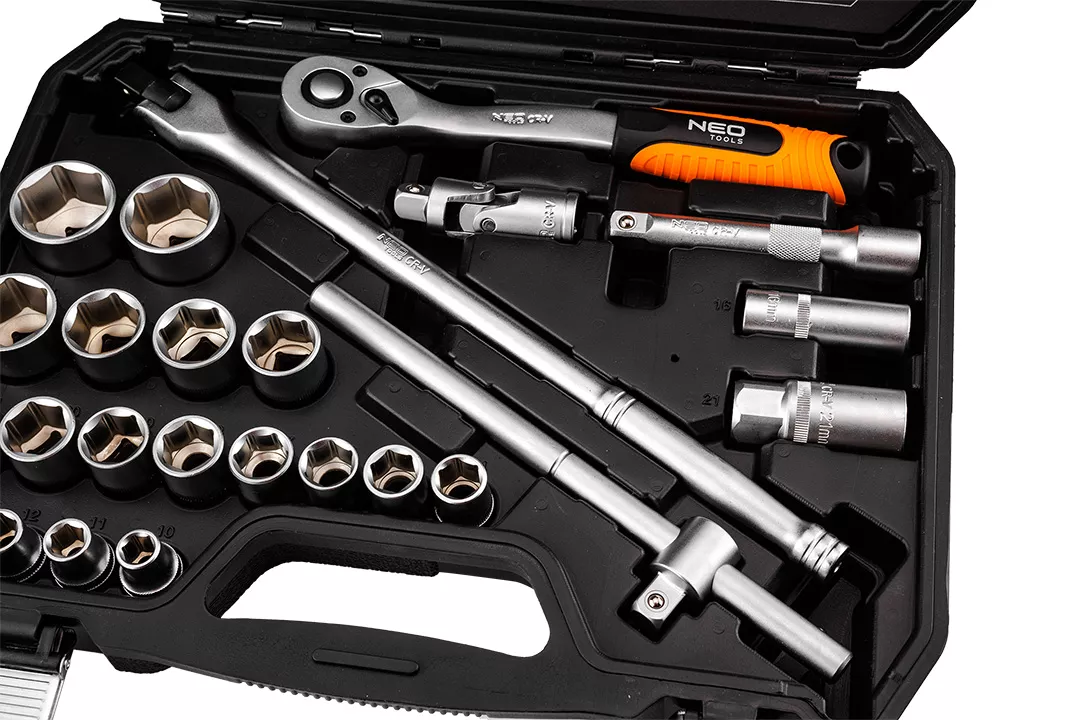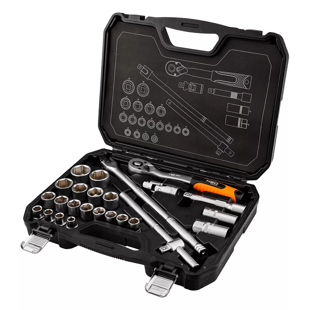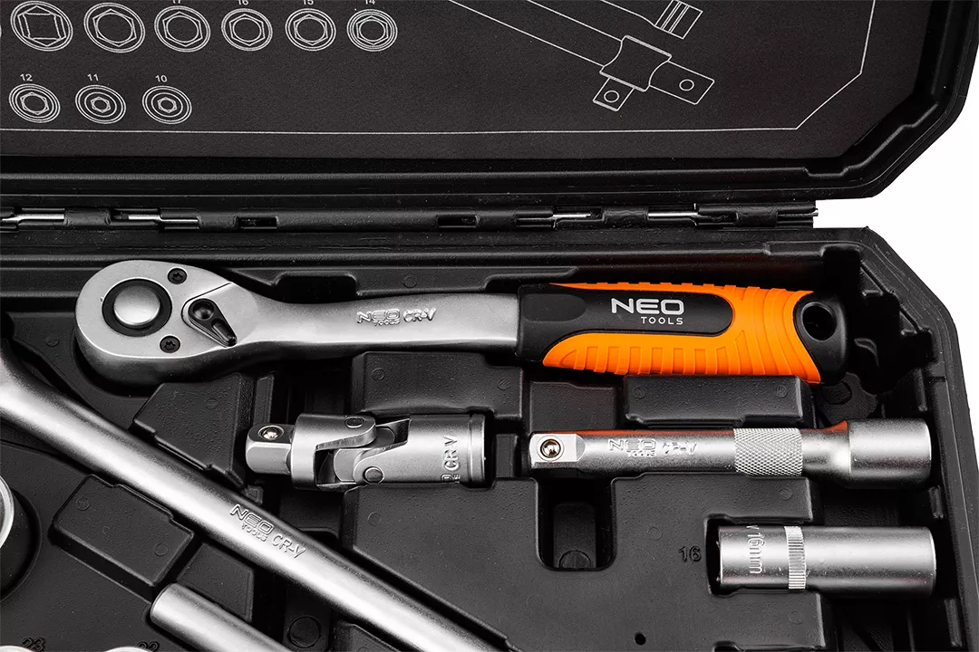 Zestaw kluczy nasadowych ½”, 25 sztuk, satyna 10-205 marki NEO TOOLS to niezbędny pakiet narzędzi w rozmiarze ½”, umieszczonych w wygodnej walizce z tworzywa sztucznego z zatrzaskami. W jego skład wchodzi 25 elementów wykonanych z wysokiej jakości stali chromowo-wanadowej, wykończonych satyną. Zestaw zawiera pakiet osiemnastu nasadek sześciokątnych w rozmiarach: 10, 11, 12, 13, 14, 15, 16, 17, 18 19, 20, 21, 22, 23, 24, 27, 30, 32 mm, grzechotkę ½” – wersja z 72 zębami oraz precyzyjnym mechanizmem zapadkowym; poręczną przedłużkę 125 mm, przegub uniwersalny ½”, pokrętło z zabierakiem 250 mm, pokrętło z przegubem 375 mm oraz 2x nasadka do świec ½” 16, 21 mm. Jakość i niezawodność produktów potwierdza 25-letnia gwarancja. Marka NEO TOOLS spełnia oczekiwania profesjonalistów.