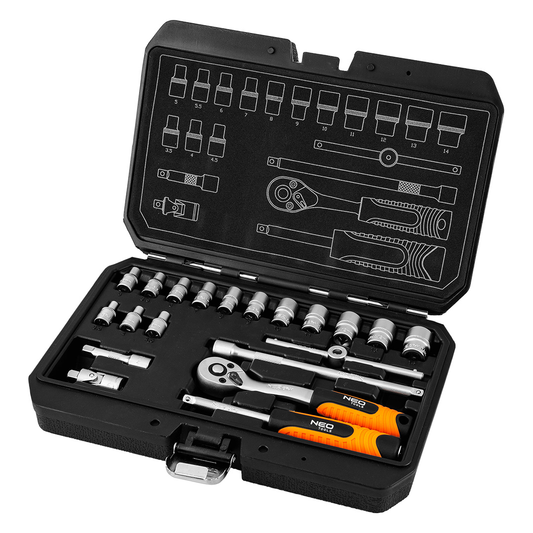 Zestaw kluczy nasadowych 1/4", 20 szt., satyna 10-230 marki NEO TOOLS zawiera 20 elementów w rozmiarze 1/4". W jego skład wchodzą: grzechotka 72T 1/4" (1 szt.) i nasadki sześciokątne krótkie 1/4" (14 szt.): 3.5, 4, 4.5, 5, 5.5, 6, 7, 8, 9, 10, 11, 12, 13, 14 mm. Zestaw zawiera również przedłużki 1/4" (2 szt.): 50 mm i 150 mm, przegub uniwersalny 1/4" (1 szt.), pokrętło z przetyczką 1/4" (T-bar) 115 mm (1 szt.) oraz pokrętło do nasadek 1/4" 150 mm (1 szt.). Wszystkie elementy wykonane zostały ze stali chromowo-wanadowej (CrV) i posiadają satynowe wykończenie. Kompaktowa walizka sprawdzi się jako poręczny zestaw narzędziowy do prostych prac mechanicznych. Komplet narzędzi od NEO TOOLS polecany jest profesjonalistom oraz majsterkowiczom.