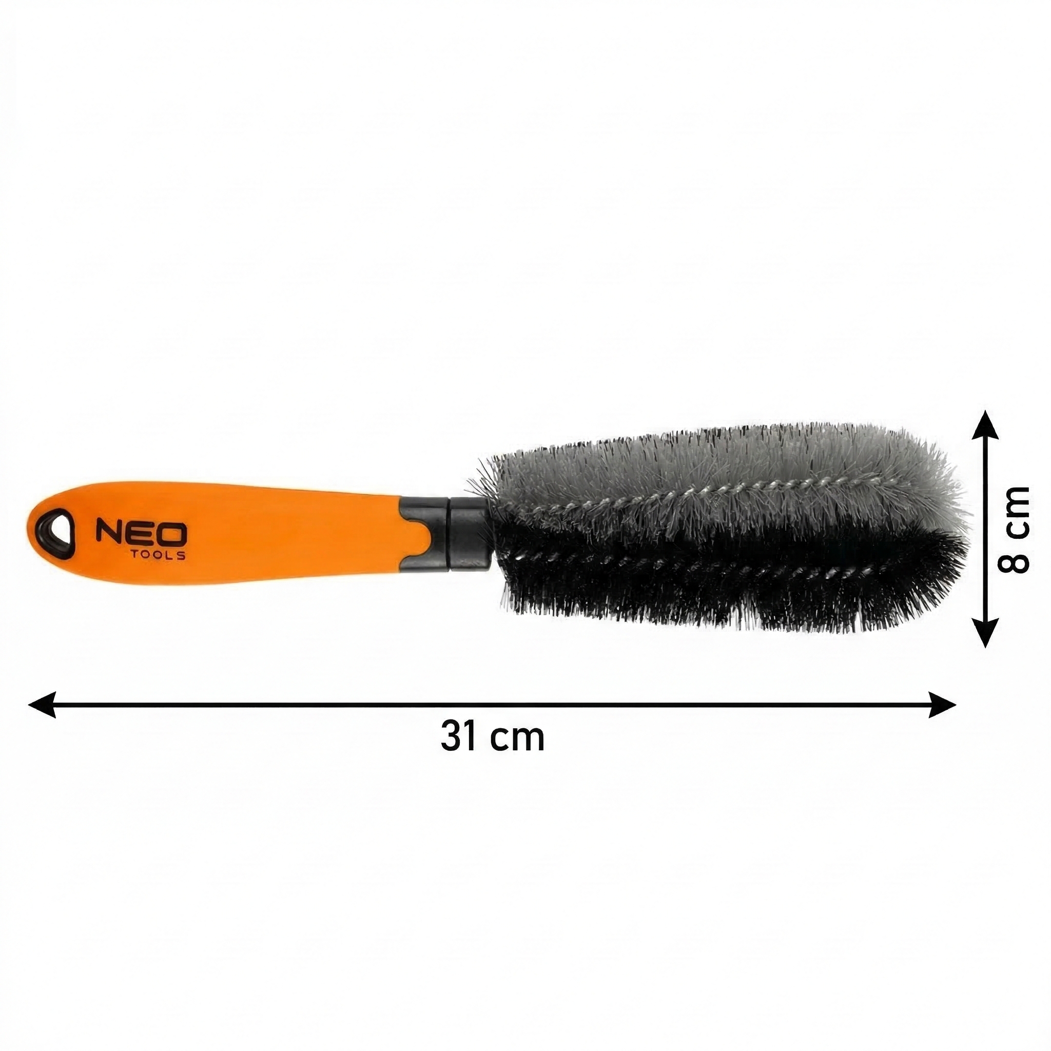 Szczotka do mycia felg 11-450 marki NEO TOOLS charakteryzuje się długością całkowitą 31 cm, a średnica części z włosiem wynosi 8 cm. Włosie wykonane jest z tworzywa PP i ma twardą, sztywną strukturę. Uchwyt również wykonano z tworzywa PP. Szczotka NEO TOOLS posiada gęste włosie odporne na działanie środków chemicznych do mycia i ergonomiczny uchwyt. Jest dedykowana do czyszczenia bardzo zabrudzonych felg.