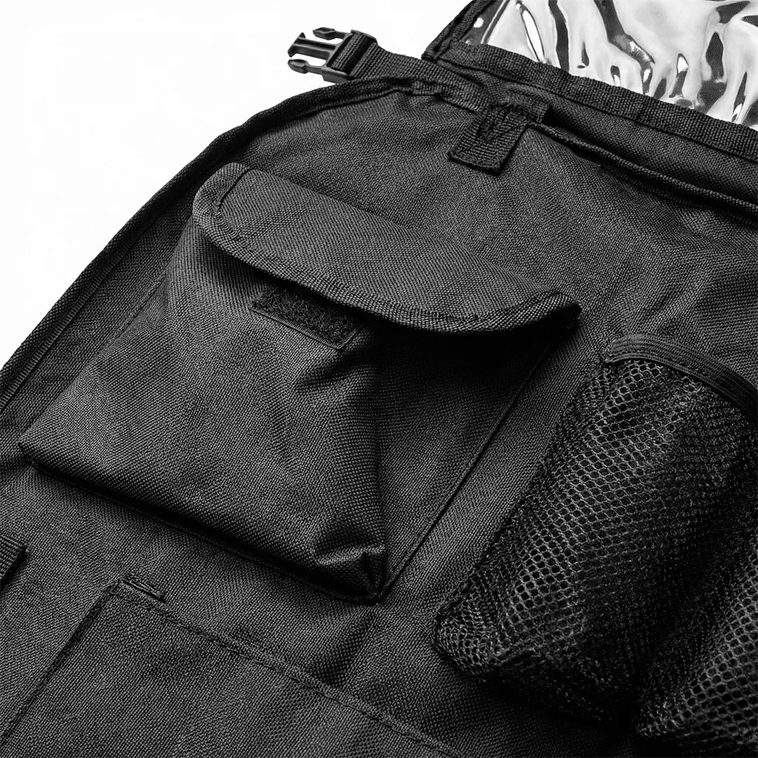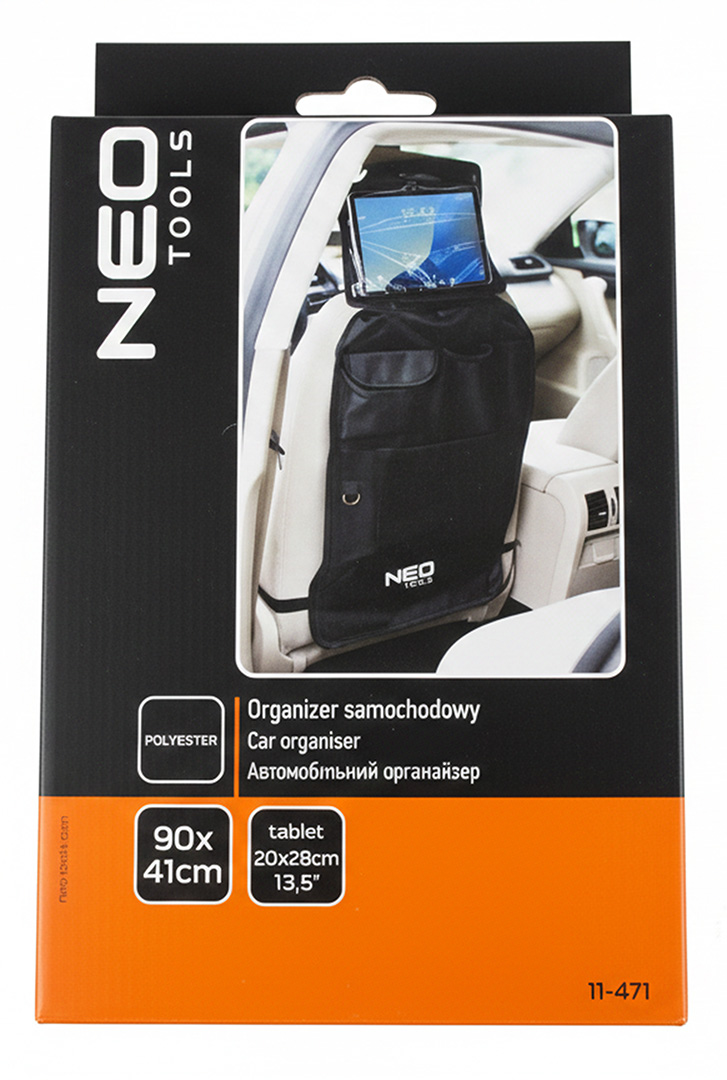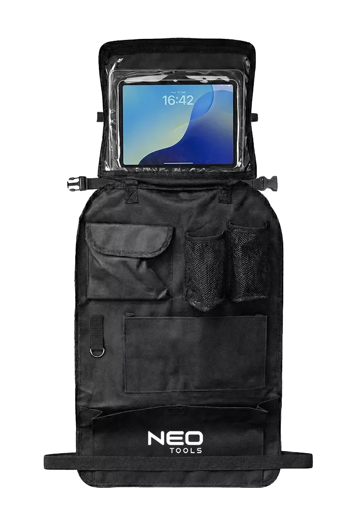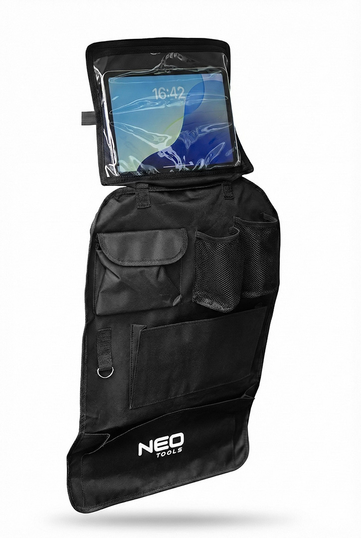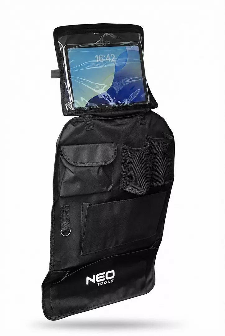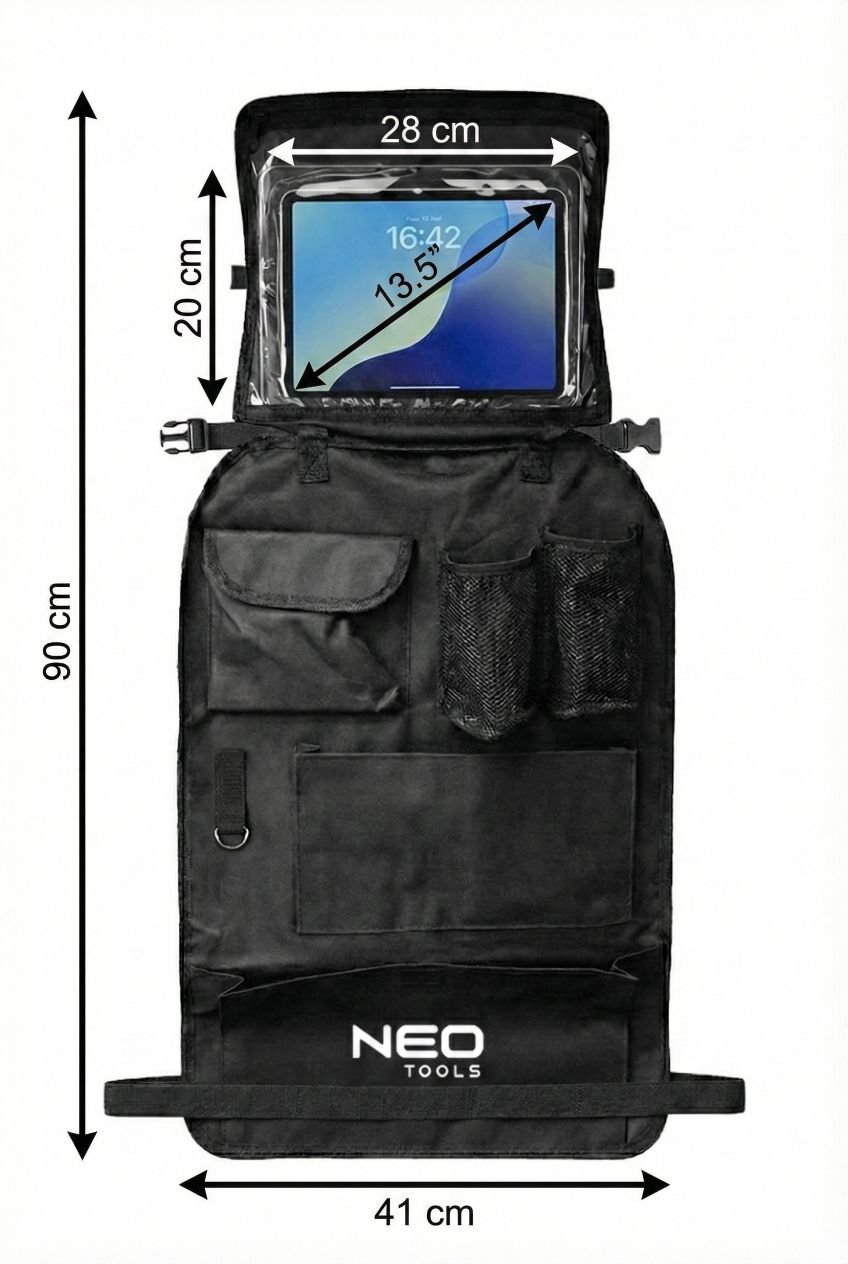 Organizer na tablet na tylne siedzenie 11-471 marki NEO TOOLS przeznaczony jest do utrzymania tabletu, telefonu oraz akcesoriów na tylnym siedzeniu samochodu. Produkt wykonany z poliestru ma wymiary całkowite 90 x 41 cm, a miejsce na tablet o wymiarach 20 x 28 cm jest dostosowane do urządzeń o przekątnej do 35 cm. Organizer montowany jest za przednim siedzeniem przy pomocy pasków elastycznych, umożliwiając szybkie zawieszenie i stabilne użytkowanie podczas jazdy. Wyposażony jest w kieszeń na tablet z folią do ekranów dotykowych, która pozwala na korzystanie z urządzenia bez wyjmowania go z organizera. Dodatkowe kieszenie ułatwiają przechowywanie drobnych przedmiotów, zwiększając komfort pasażerów siedzących z tyłu oraz pomagając w utrzymaniu porządku w samochodzie.