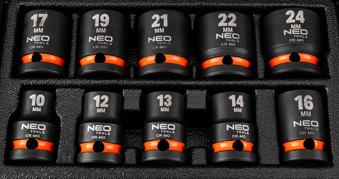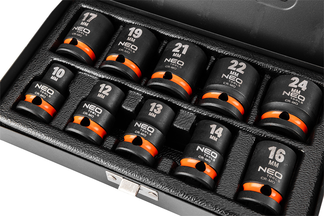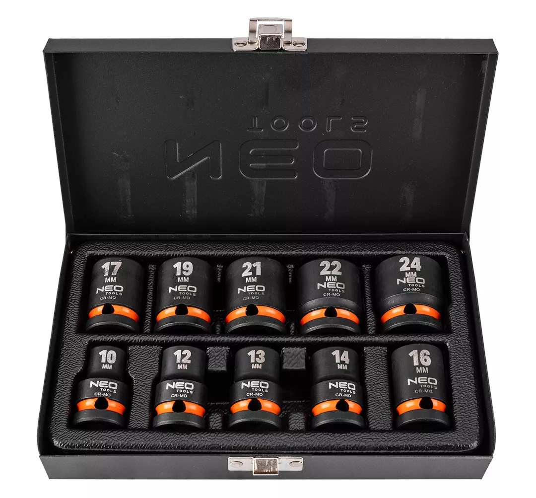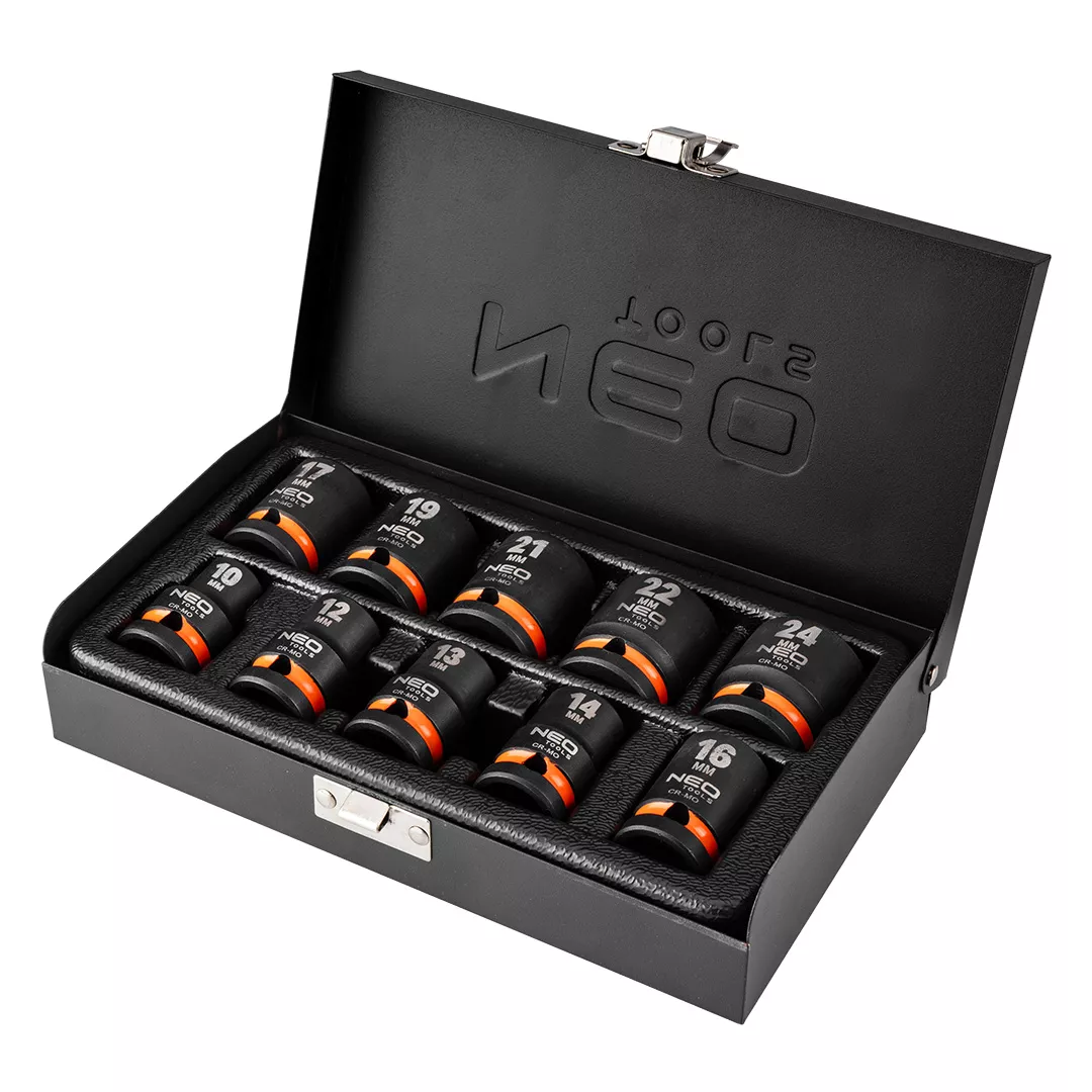 Zestaw nasadek udarowych 1/2" NEO (nr ref. 12-101) sześciokątnych, krótkich, składa się z 10 elementów. Zawiera sześciokątne nasadki udarowe w popularnych rozmiarach od 10 do 24 mm. Krótkie nasadki wygodne do pracy w trudnodostępnych miejcach. Wykonane z wytrzymałej stali chromowo-wanadowej. Nasadki o przedłużonej żywotności dzięki produkcji metodą kucia na gorąco. Dostarczane w praktycznej, metalowej kasecie do przechowywania. Marka NEO spełnia oczekiwania profesjonalistów.