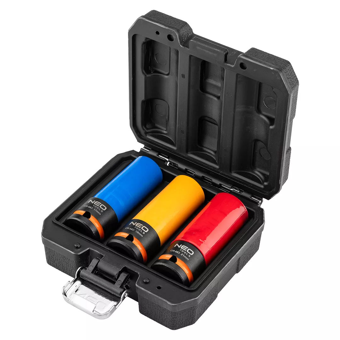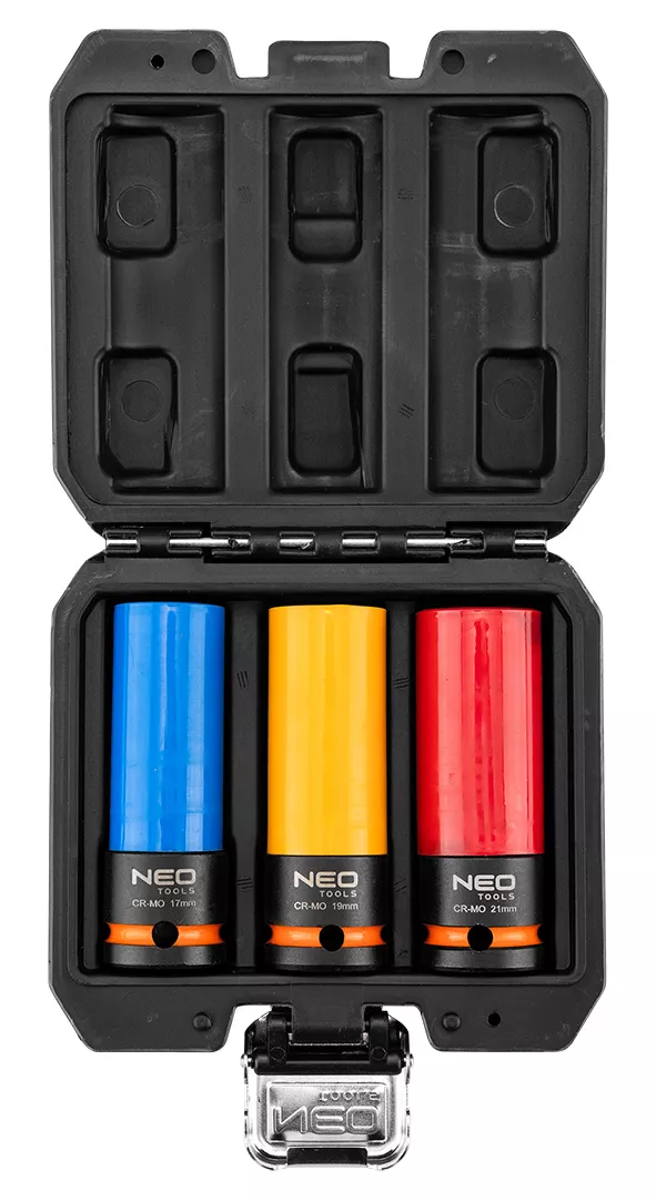 Nasadki do felg aluminiowych NEO to zestaw 3 najpopularniejszych rozmiarów nasadek (17 mm, 19 mm, 21 mm). Komplet przeznaczony do odkręcania śrub o różnej średnicy w gniazdach felg aluminiowych. Nasadki zostały wykonane ze stali chromowo-molibdenowej. Nasadki mają teflonowe kołnierze zabezpieczające, które chronią felgę przed uszkodzeniem powłoki lakierniczej. Nasadki są w 3 kolorach, co ułatwia rozróżnienie rozmiarów. Nasadki mają zabezpieczenie ułatwiające uwolnienie odkręconej nasadki i śruby. Zestaw zapakowany jest w etui.
