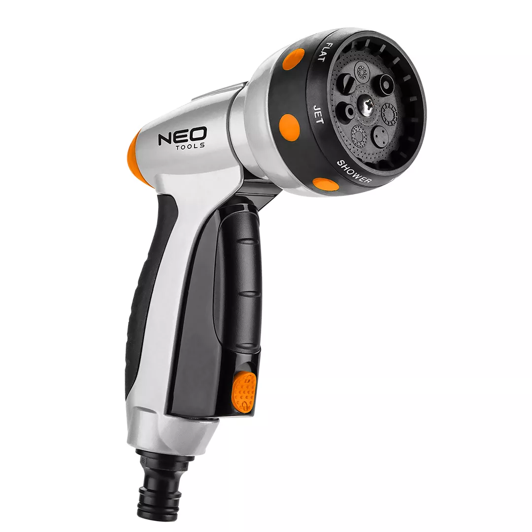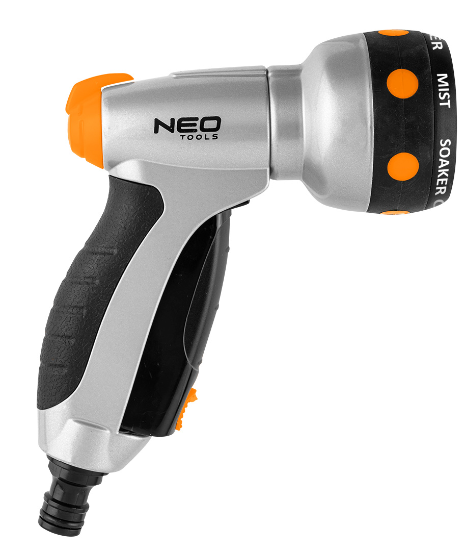 Zraszacz 7-funkcyjny NEO (nr ref. 15-706) przeznaczony jest do nawadniania m.in. trawników. Wyposażony jest w 7 funkcji podlewania, które pozwalają dopasować rodzaje strumienia do potrzeb: ciągły strumień, mgiełka, kilka strumieni ze środka, delikatne strumienie, prysznic, płaski strumień, rozproszony strumień. Pistolet posiada blokadę przedniej dźwigni dzięki czemu może pracować w trybie ciągłym. Uchwyt o ergonomicznym kształcie dobrze leży w dłoni i nie wyślizguje się, co podnosi komfort pracy.