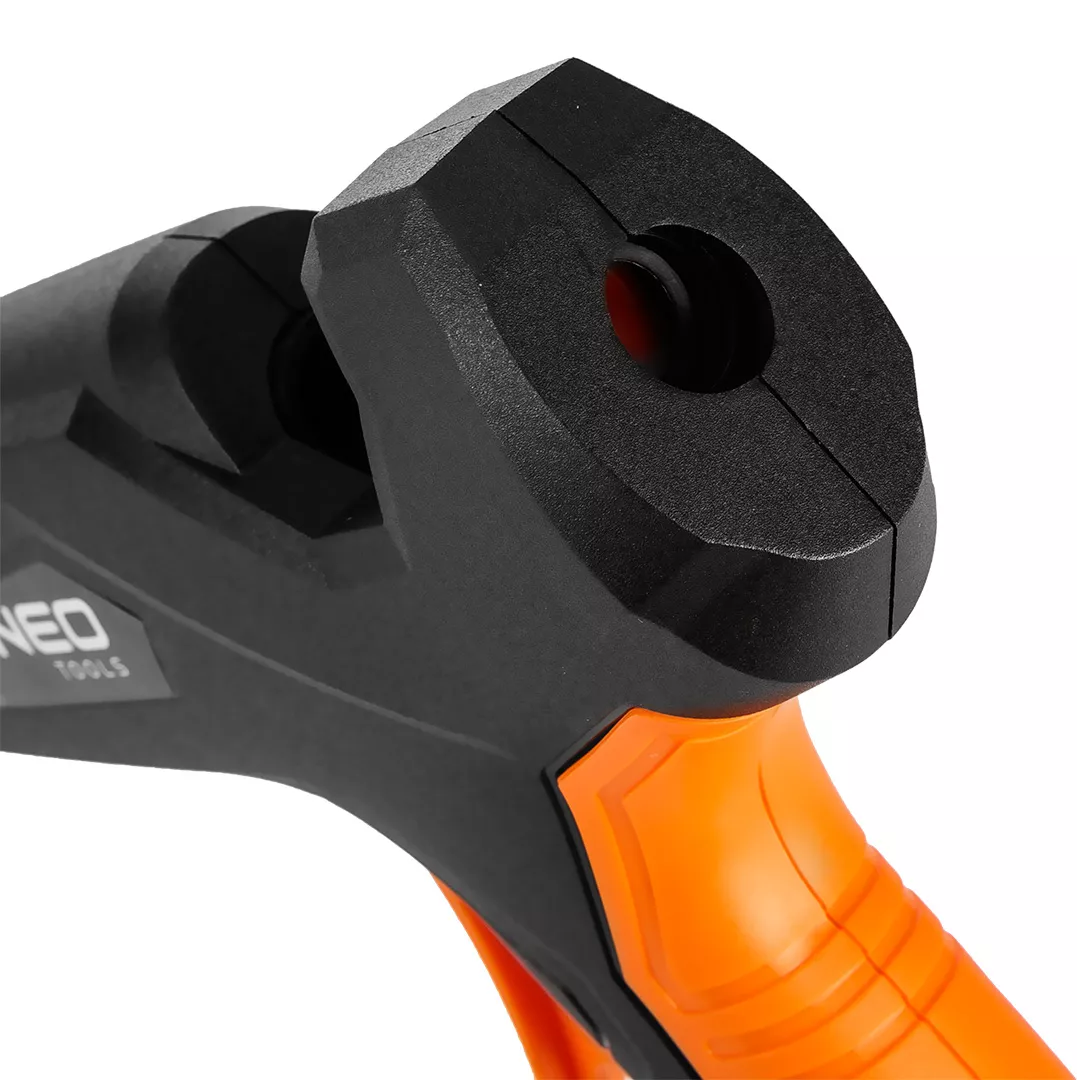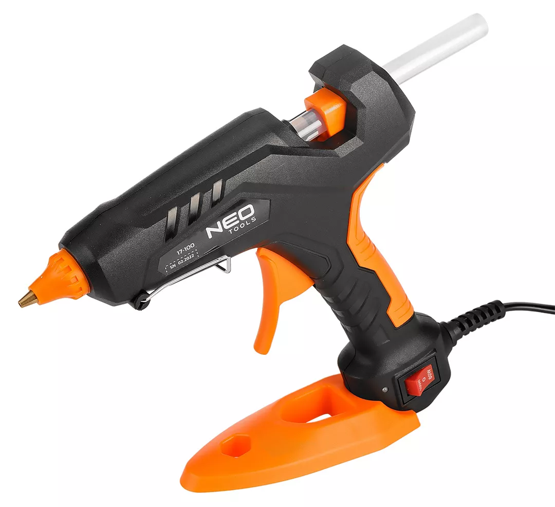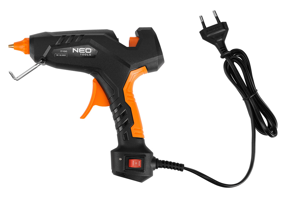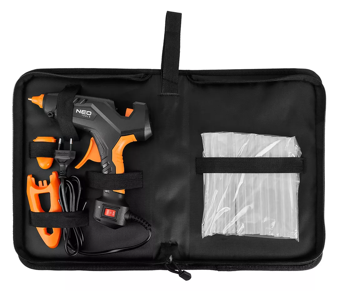 Zestaw: pistolet klejowy 11 mm, 60/100 W, 12 wkładów klejowych, 3 ochraniacze palców, etui materiałowe 17-100 marki NEO to kompleksowy zestaw przydatny w warsztacie majsterkowicza lub artysty, przy mocowaniu wykładzin lub produkcji mebli. W jego skład wchodzi pistolet klejowy o mocy 60 lub 100 W, przystosowany do wkładów o średnicy 11 mm. Urządzenie pracuje w dwóch temperaturach: 120 oraz 190 stopni Celsjusza. Wyposażone jest w praktyczny bezpiecznik, wydajną grzałkę ceramiczną PTC oraz podświetlany wyłącznik. Posiada miedzianą, wymienną dyszę, zapobiegającą kapaniu. Czas nagrzewania mieści się w przedziale od 3 do maksymalnie 5 minut. Zestaw uzupełniony jest o podstawkę z tworzywa, wpływającą na stabilność, 12 sztuk wkładów klejowych 11 mm, 3 osłonki na palce oraz materiałowe etui z zamkiem błyskawicznym.