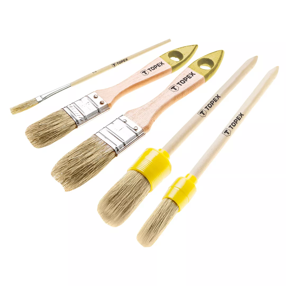 Zestaw pędzli TOPEX (nr ref. 20B816) w skład zestawu wchodzi 5 szt. pędzli, w tym 2 pędzle płaskie w rozmiarach 1" i 1.5", pędzle owalne nr 2 i 4 oraz pędzel mini. Są to pędzle o uniwersalnym zastosowaniu. Zestaw pędzli TOPEX będzie przydatny podczas drobnych prac malarskich i remontowych. Marka TOPEX skierowana jest do majsterkowiczów.