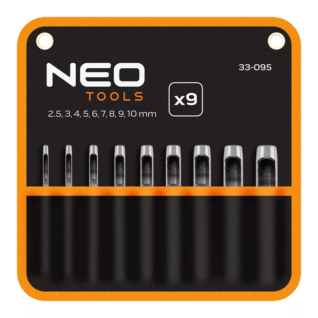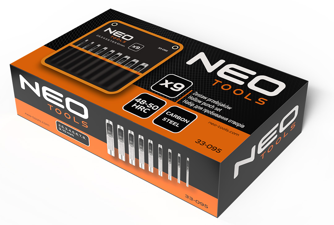 Zestaw 9 przebijaki, średnica 2,5-10 mm, oxford pouch 33-095 marki NEO TOOLS o średnicach 2,5; 3; 4; 5; 6; 7; 8; 9; 10 mm to praktyczne narzędzia znajdujące zastosowanie w szewstwie, kaletnictwie, rymarstwie, krawiectwie, w pracy ze skórą, skajem, gumą oraz tekturą. Wykonane zostały ze stali węglowej 45#, z powierzchnią moletowaną i polerowaną. Ich twardość wynosi solidne 48–50 HRC. Zestaw NEO TOOLS zapakowany jest w praktyczne, materiałowe etui typu oxford, ułatwiające przechowywanie. Będzie niezbędny do uniwersalnego wycinania okrągłych otworów.