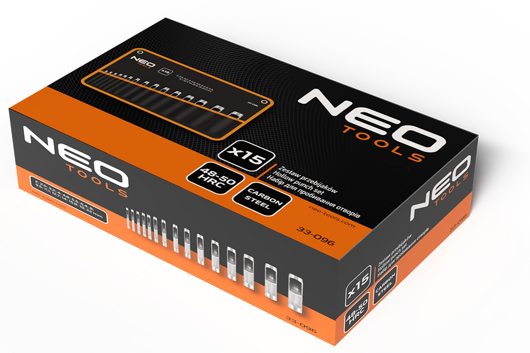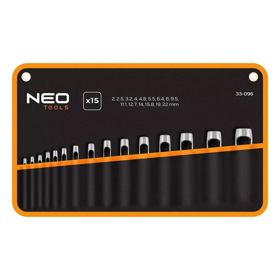 Zestaw 15 przebijaków, średnica 2-22 mm, oxford pouch 33-096 marki NEO TOOLS o średnicach 2; 2,5; 3,2; 4; 4,8; 5,5; 6,4; 7; 8; 9,5; 11,1; 12,7; 14; 15,8; 19; 22 mm to praktyczne narzędzia znajdujące zastosowanie w szewstwie, kaletnictwie, rymarstwie, krawiectwie, w pracy ze skórą, skajem, gumą oraz tekturą. Wykonane zostały ze stali węglowej 45#, z powierzchnią moletowaną i polerowaną. Ich twardość wynosi solidne 48–50 HRC. Zestaw NEO TOOLS zapakowany jest w praktyczne, materiałowe etui typu oxford, ułatwiające przechowywanie. Będzie niezbędny do uniwersalnego wycinania okrągłych otworów.