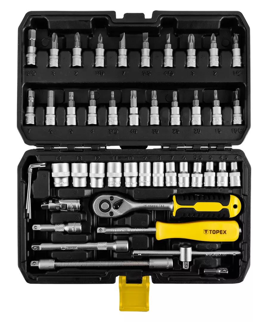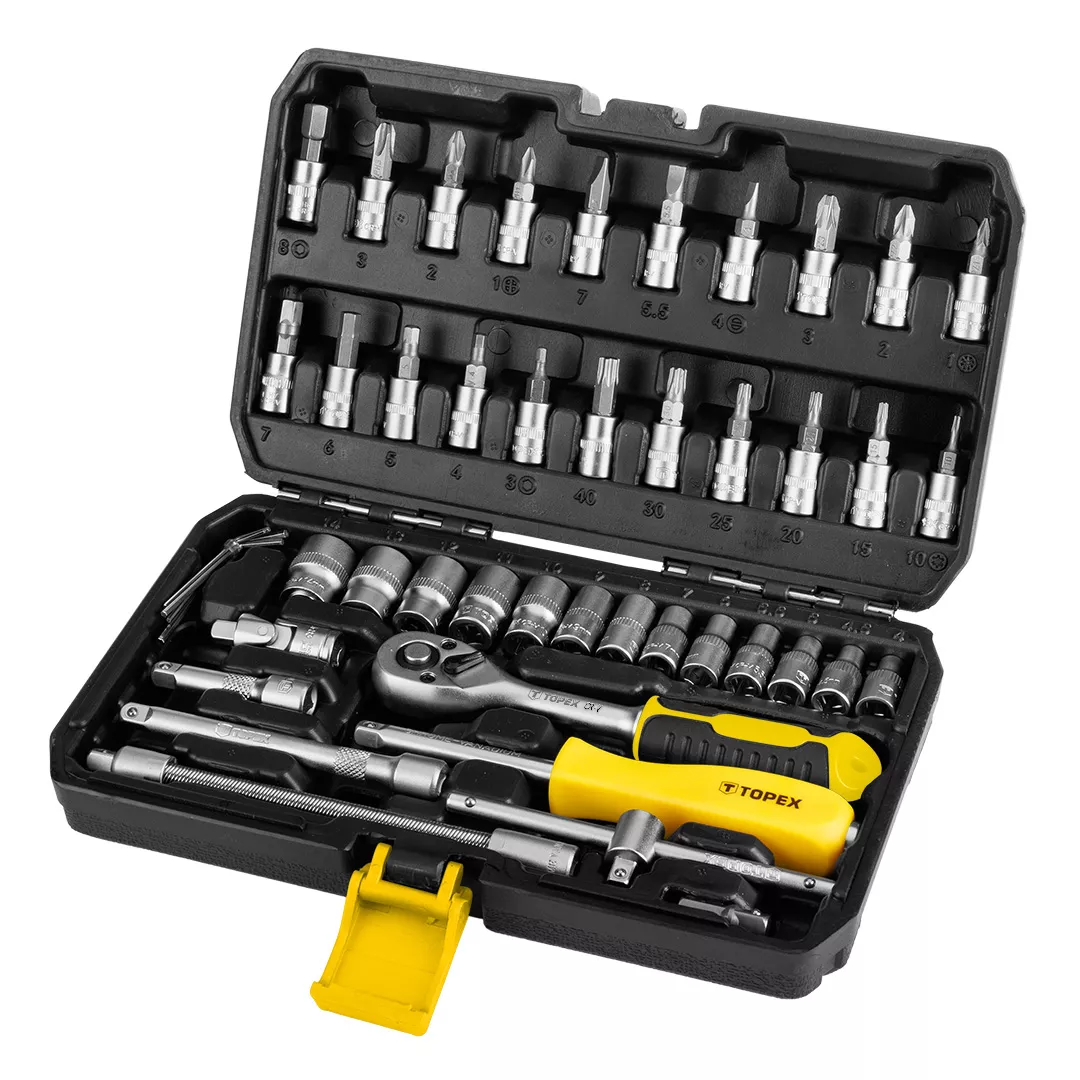 Klucze nasadowe 1/4", zestaw 46 szt. 38D640 marki TOPEX to zestaw praktycznych narzędzi, przydatnych w każdym gospodarstwie domowym. Składa się on z 46 elementów: kluczy nasadowych 1/4", bitów na nasadkach 1/4", 21 szt.: PH1, PH2, PH3, PZ1, PZ2, PZ3, H3, H4, H5, H6, H7, H8, T10, T15, T20, T25, T30, T40, SL4, SL5.5, SL7; nasadek 1/4" 13 szt.: 4, 4.5, 5, 5.5, 6, 7, 8, 9, 10, 11, 12, 13, 14 mm; kluczy sześciokątnych 4 szt.: 1.27, 1.5, 2.0, 2.5 mm; przedłużek 1/4" 2 szt. 50 mm i 100 mm; przedłużki elastycznej 1/4" 150 mm; grzechotki 1/4" 72T 150 mm; pokrętła typu T 1/4" 110 mm; uchwytu do bitów 1/4" 150 mm; przegubu uniwersalnego 1/4" 40 mm oraz adapteru do wkrętarki. Zestaw TOPEX oferowany jest w praktycznej walizce z tworzywa sztucznego. Będzie niezbędny dla majsterkowiczów.