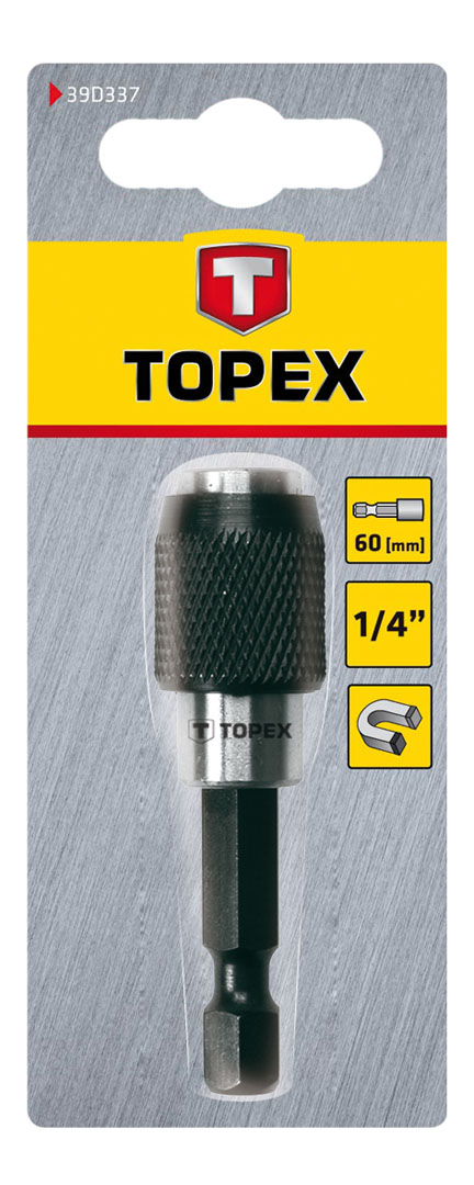 Uchwyt do końcówek TOPEX (nr ref. 39D337) o długości 60 mm przeznaczony do wkrętarek i wiertarko-wkrętarek z końcówką w rozmiarze 1/4”. Dzięki mocowaniu zatrzaskowemu wymiana bitów jest szybka i łatwa. Marka TOPEX skierowana jest do majsterkowiczów.