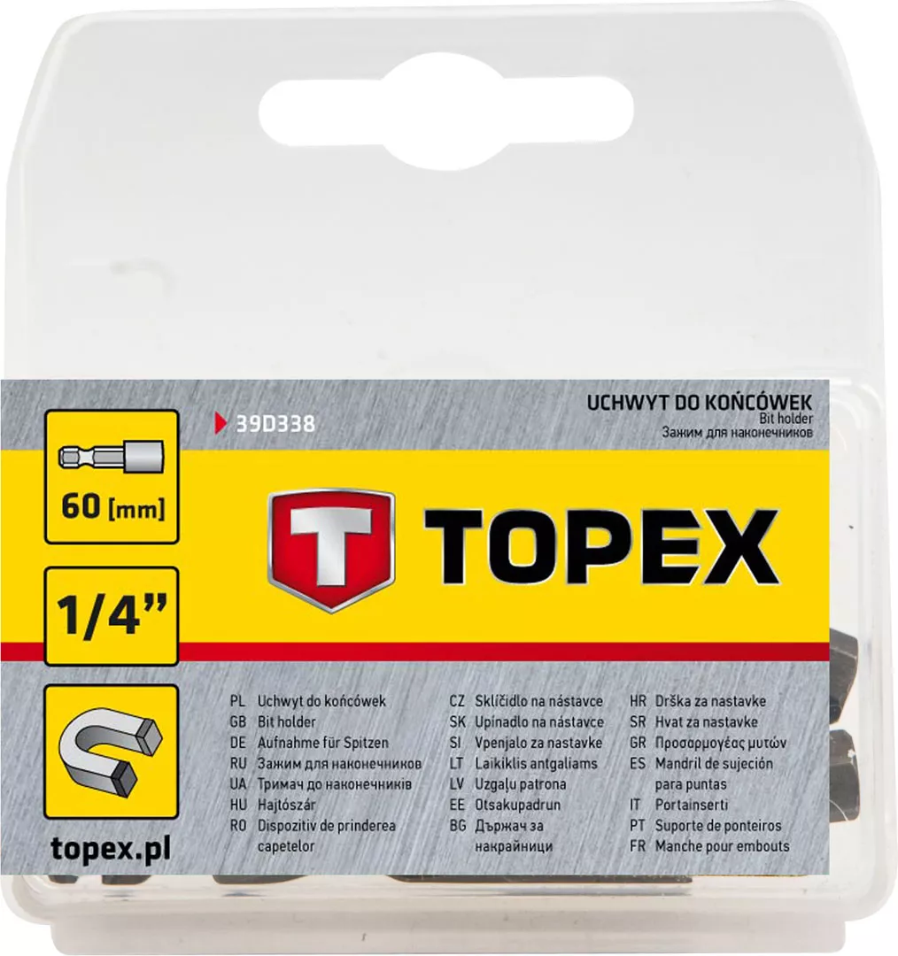 Uchwyt do końcówek TOPEX (nr ref. 39D338) o długości 60 mm przeznaczony do wkrętarek i wiertarko-wkrętarek z końcówką w rozmiarze 1/4”. Umożliwia szybką i prostą wymianę bitów. Marka TOPEX skierowana jest do majsterkowiczów.
