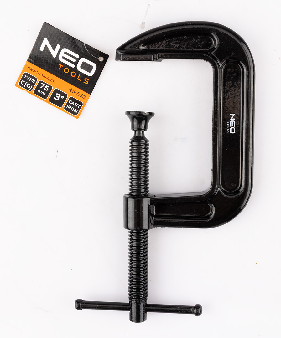 Ścisk stolarski (śrubowy), typ C (G), 75 mm (3"), żeliwny, waga 485 g 45-552 marki NEO TOOLS to ścisk z żeliwa, charakteryzujący się rozmiarem 75 mm (3”). Jego waga wynosi 485 g. Pozwala osiągnąć maksymalną siła docisku na poziomie 2200 N. Sprawdzi się w wielu zadaniach.