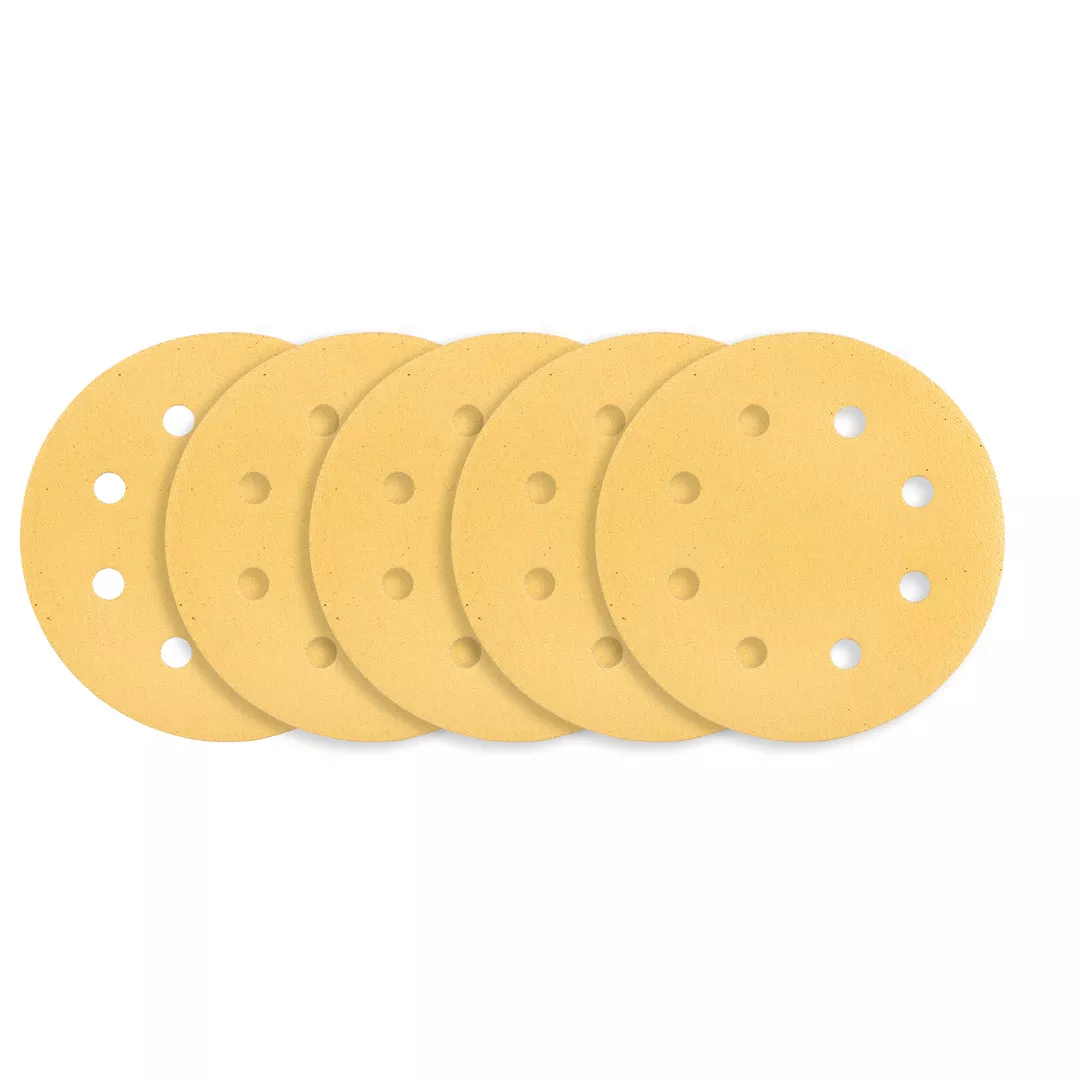 Papier ścierny na rzep, krążek, średnica 180 mm, średnica między środkami otworów 110 mm, średnica otworów 10 mm, 5 sztuk, P120, z 8 otworami, do szlifierki 59G263, zastosowanie: płyty karton-gipsowe