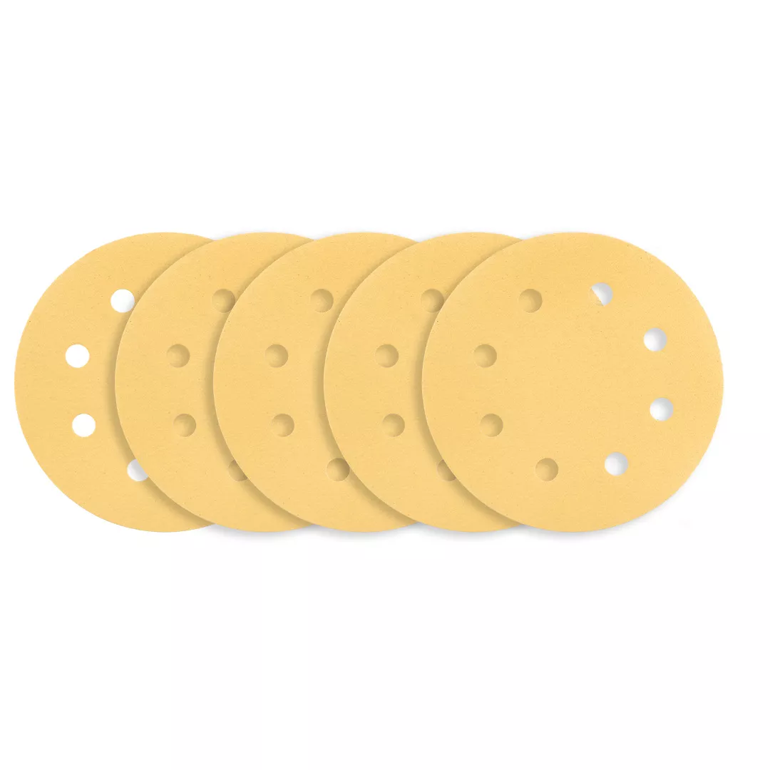 Papier ścierny na rzep, krążek, średnica 180 mm, średnica między środkami otworów 100 mm, średnica otworów 10 mm, 5 sztuk, P180, z 8 otworami, do szlifierki 59G263, zastosowanie: płyty karton-gipsowe