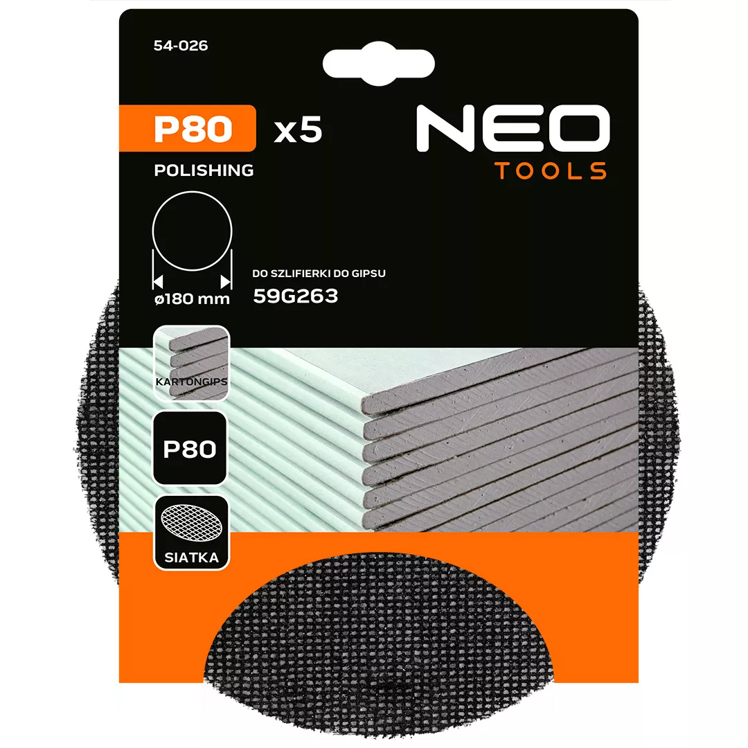 Siatka ścierna na rzep, krążek, P80, średnica 180 mm, do szlifierki do gipsu 59G263, 5 sztuk, zastosowanie: płyty karton-gipsowe