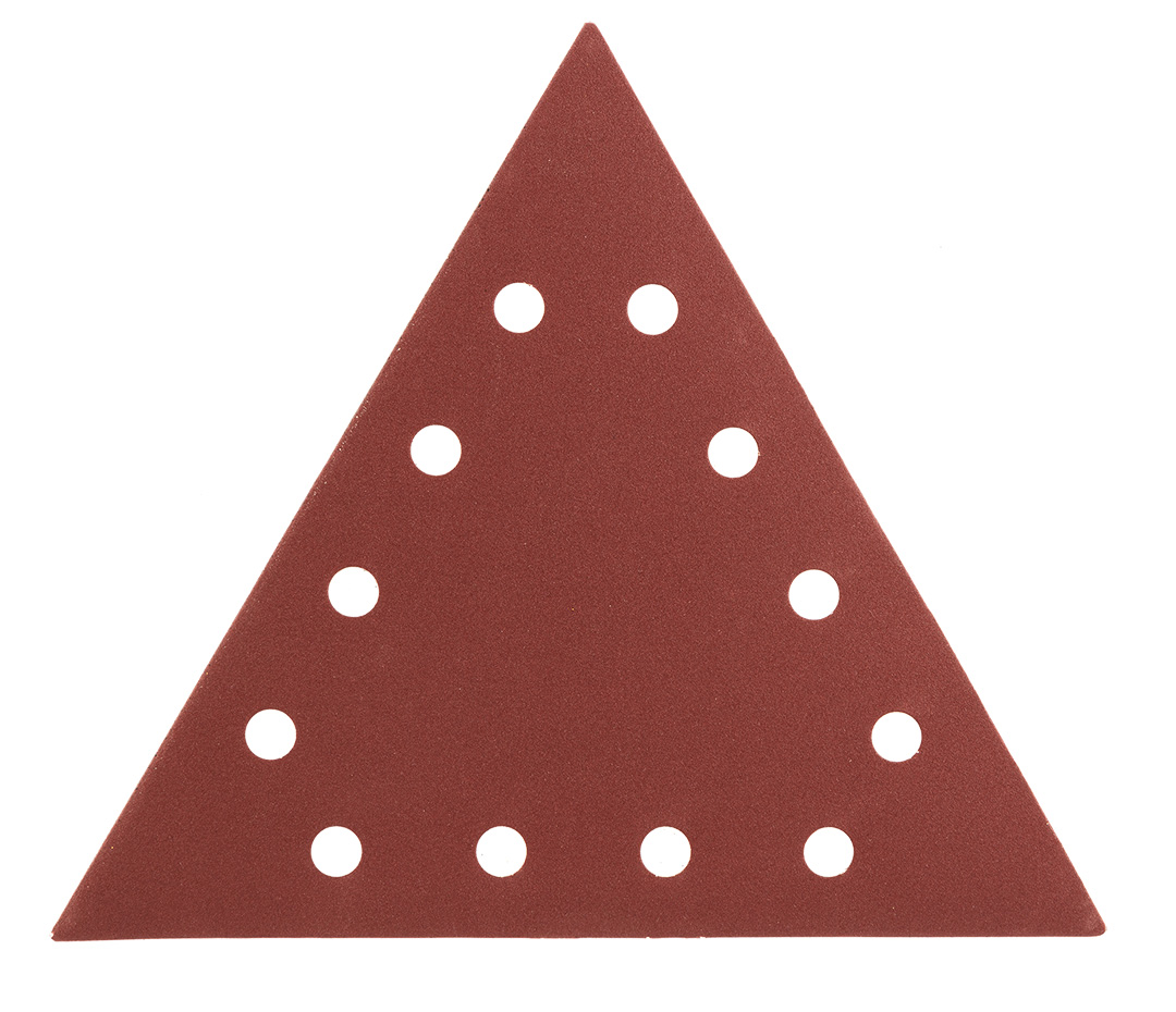Papier ścierny na rzep, trójkątny, 5 sztuk, długość boków 285 mm, wysokość 245 mm, kąty wewnętrzne 60°, odległość między środkami otworów 45 mm, odległość środka otworu od krwędzi 24 mm, średnica otworu 12 mm, P180, 12 otworów, do szlifierki 59G264, zastosowanie: płyty karton-gipsowe