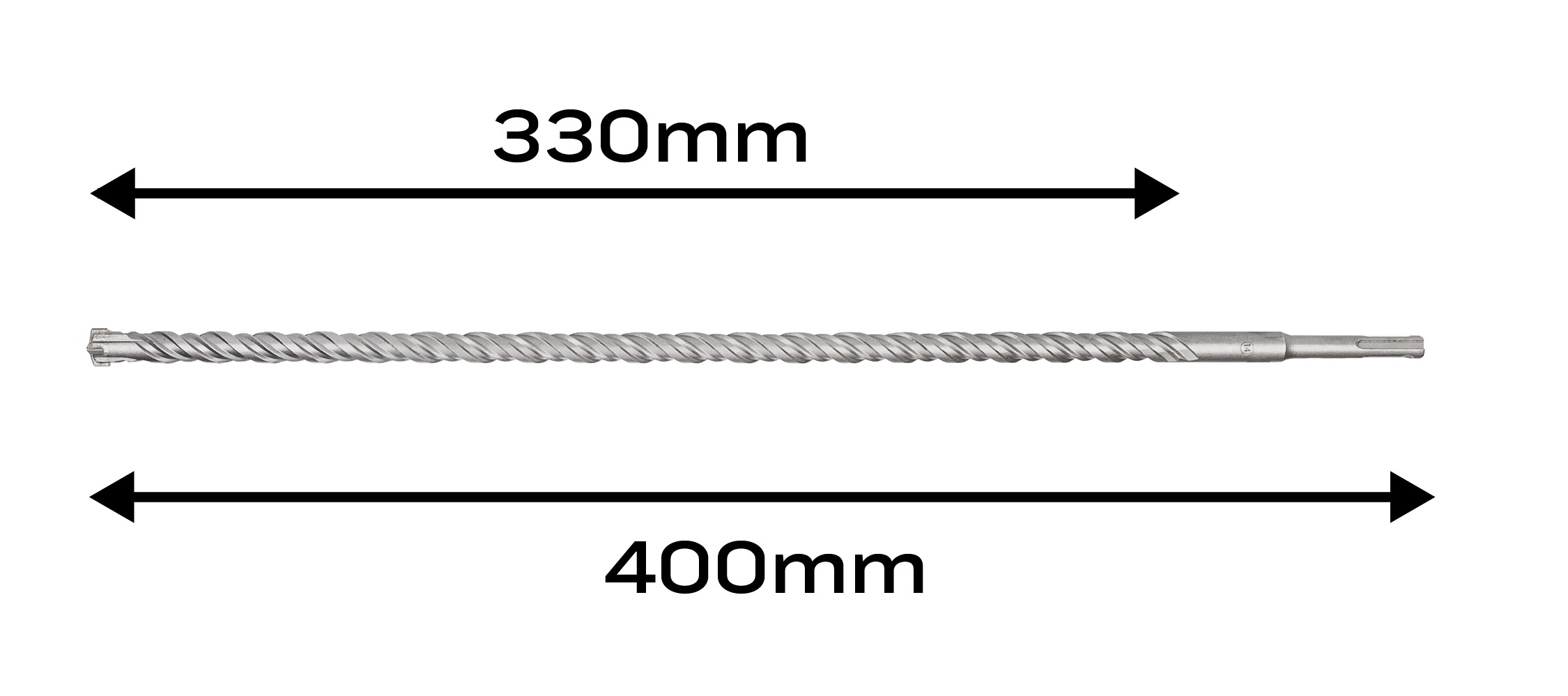 Wiertło do betonu zbrojonego SDS Plus 14 x 400 mm, quatro 54-128 marki NEO TOOLS to akcesorium charakteryzujące się średnicą 12 mm oraz długością całkowitą 400 mm i długością roboczą 330 mm. Wyposażone w uchwyt SDS Plus, podwójną spiralę oraz widia QUATRO (cztery krzyżowo osadzone widie) doskonale nadaje się do pracy w zbrojonym betonie. Krzyżowa końcówka wykonana została z drobnoziarnistego węglika spiekanego. To wytrzymałe narzędzie od marki NEO TOOLS polecane profesjonalistom do intensywnego użytkowania.
