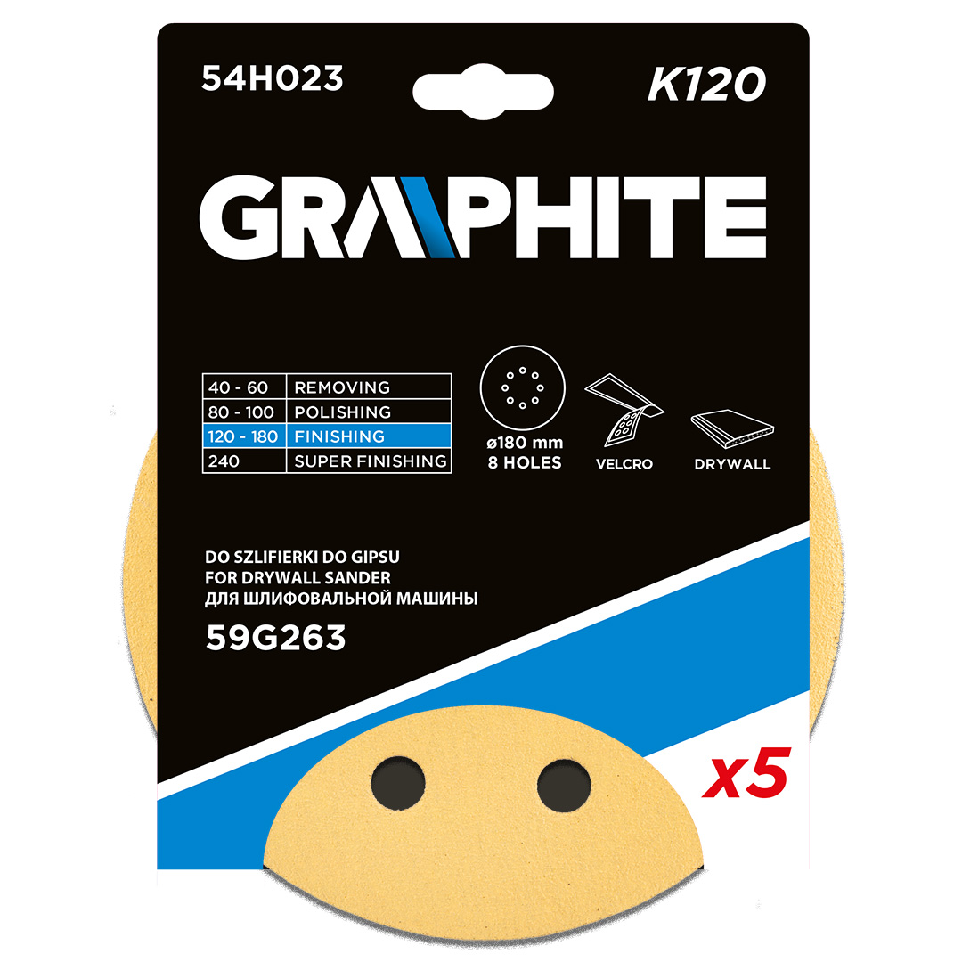 Krążek ścierny na rzep 180 mm, K120, 5 szt., z 8 otworami do szlifierki 59G263, 54H023 marki GRAPHITE o średnicy 180 mm i gradacji K120. Opakowanie zawiera pięć sztuk krążków, przeznaczonych do szlifierki do gipsu 59G263 GRAPHITE. Akcesoria posiadają 8 praktycznych otworów, rozmieszczonych na 110 mm. Krążki na rzep wykonane zostały z typu papieru C. Charakteryzują się półotwartym nasypem i ziarnem wykonanym z elektrokorundu. Będą odpowiednie zarówno do zastosowań profesjonalnych jak i podczas zadań majsterkowicza.