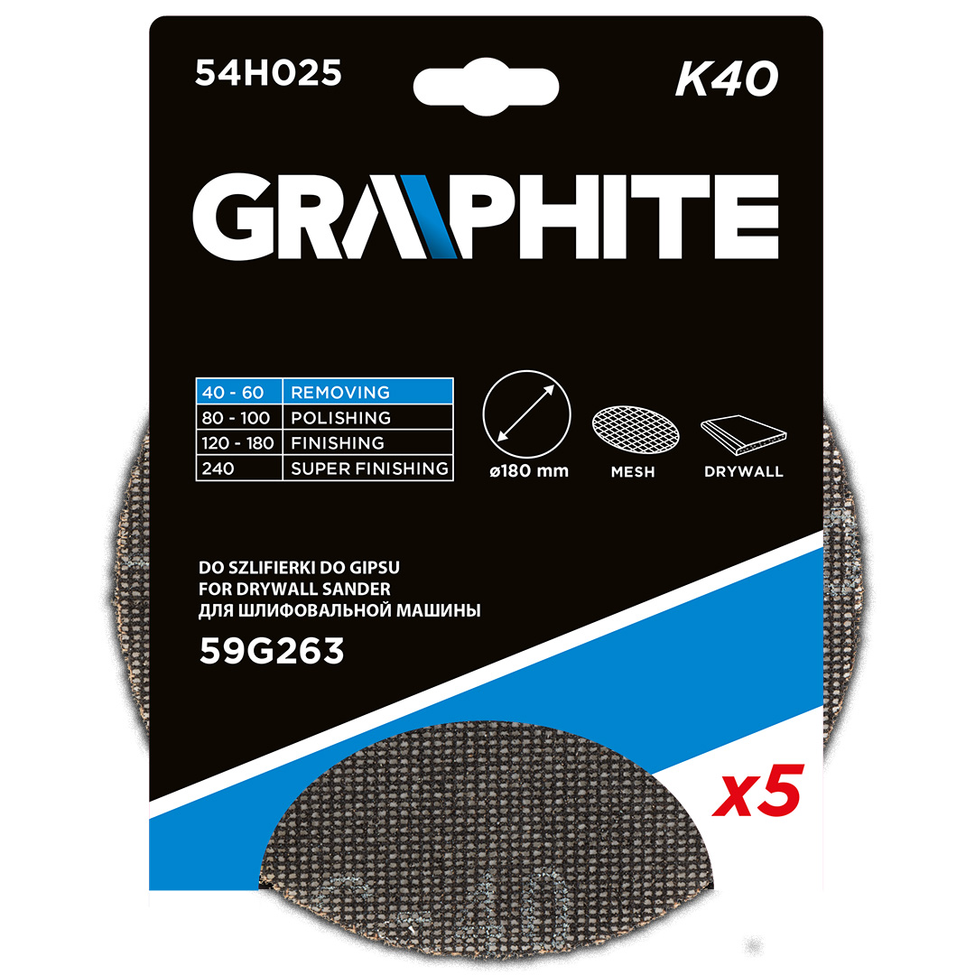 Siatka ścierna na rzep 180 mm, K40, 5 szt., do szlifierki 59G263, 54H025 marki GRAPHITE o średnicy 180 mm i gradacji K40. Opakowanie zawiera pięć sztuk siatek, przeznaczonych do szlifierki do gipsu 59G263 GRAPHITE. Akcesoria wykonane zostały z węglika krzemu. Charakteryzują się długą żywotnością oraz łatwą wymianą. Będą odpowiednie zarówno do zastosowań profesjonalnych jak i podczas różnych zadań majsterkowicza.
