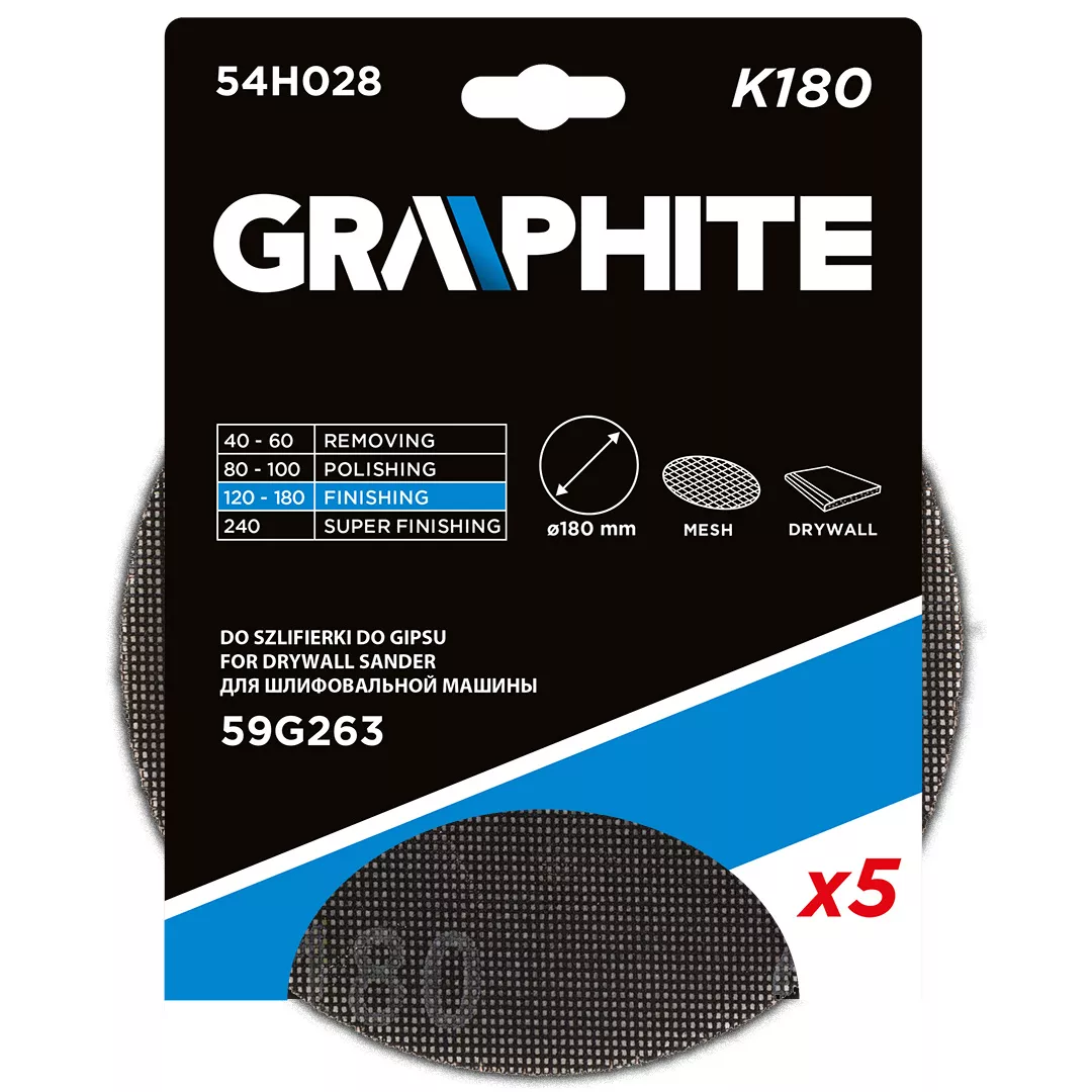 Siatka ścierna na rzep 180 mm, K180, 5 szt., do szlifierki 59G263, 54H028 marki GRAPHITE o średnicy 180 mm i gradacji K180. Opakowanie zawiera pięć sztuk siatek, przeznaczonych do szlifierki do gipsu 59G263 GRAPHITE. Akcesoria wykonane zostały z węglika krzemu. Charakteryzują się długą żywotnością oraz łatwą wymianą. Będą odpowiednie zarówno do zastosowań profesjonalnych jak i podczas różnych zadań majsterkowicza.