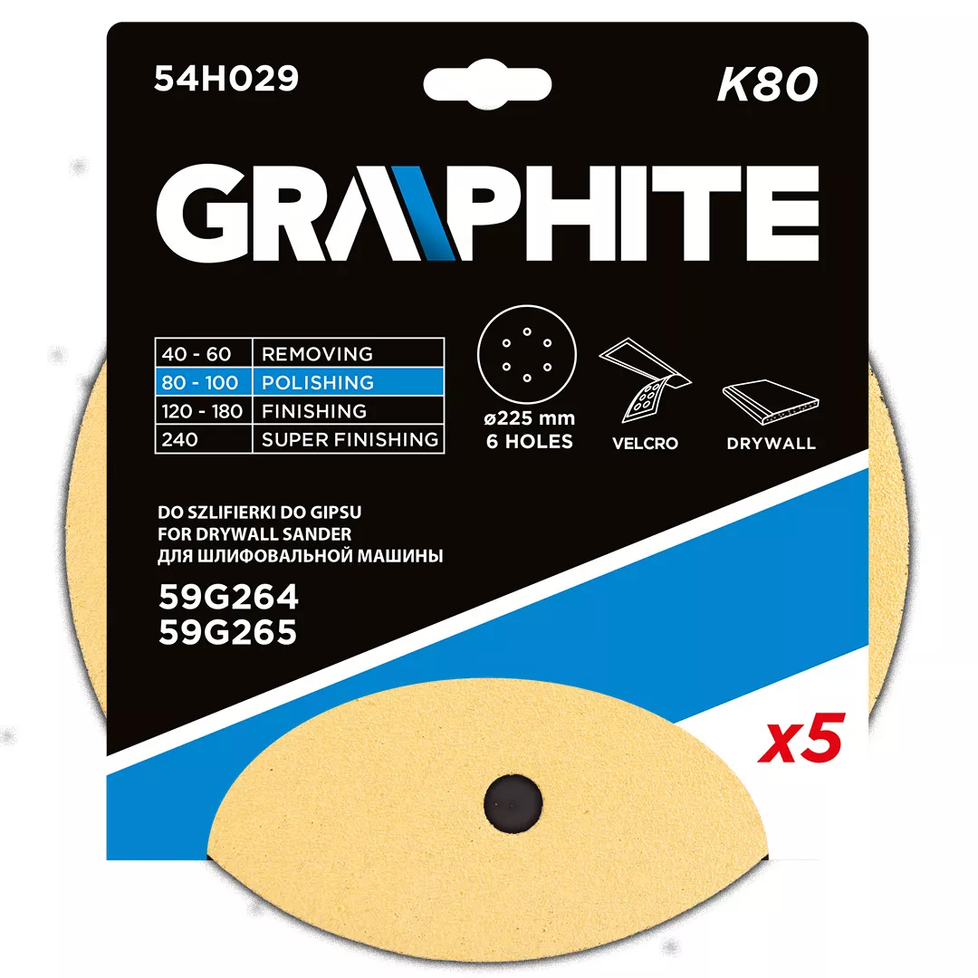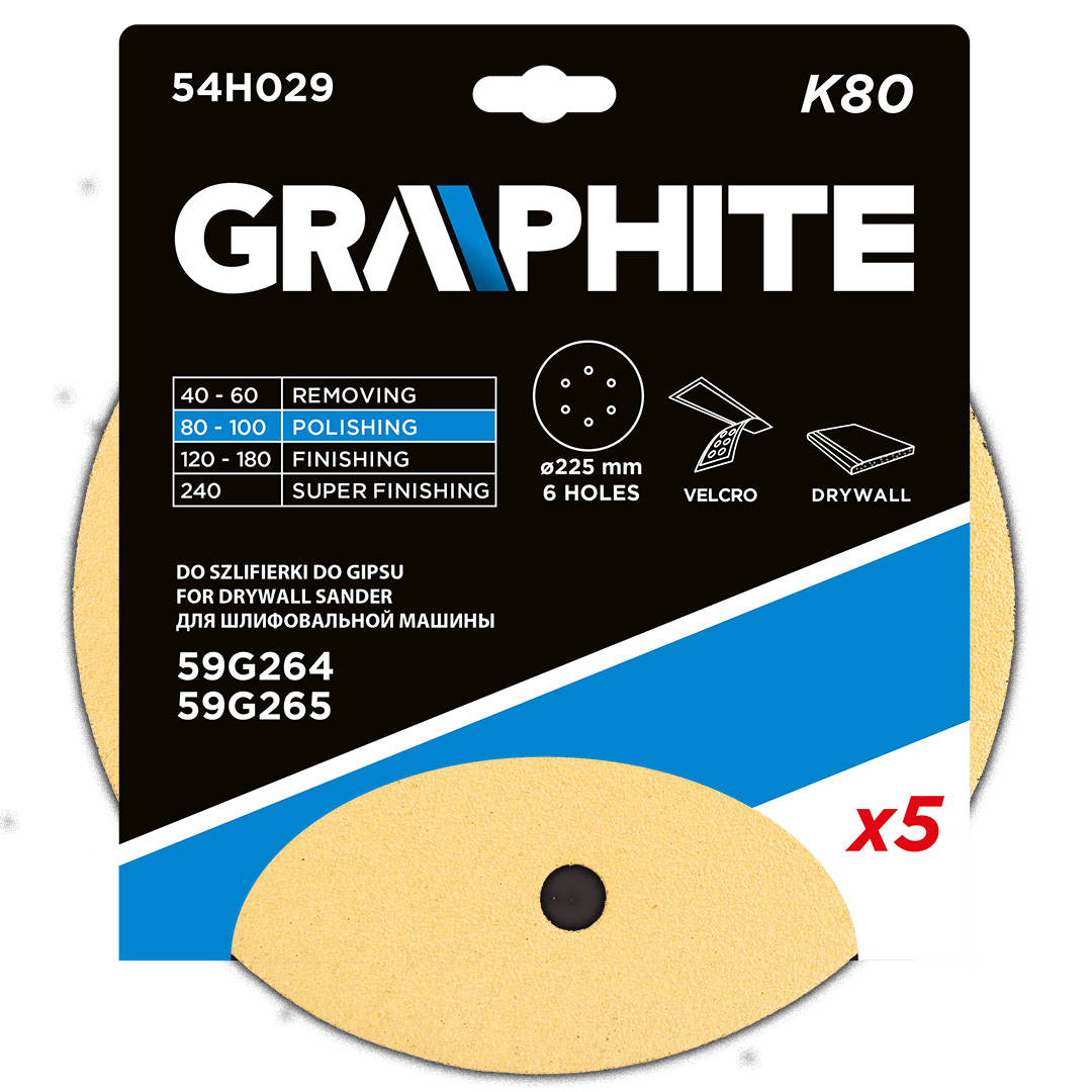 Krążek ścierny na rzep 225 mm, K80, 5 szt., z 6 otworami do szlifierki 59G264 i 59G265, 54H029 marki GRAPHITE o średnicy 225 mm i gradacji K80. Opakowanie zawiera pięć sztuk krążków, przeznaczonych do szlifierek do gipsu 59G264 i 59G265 GRAPHITE. Akcesoria posiadają 6 praktycznych otworów, rozmieszczonych na 139 mm. Krążki na rzep wykonane zostały z typu papieru C. Charakteryzują się półotwartym nasypem i ziarnem wykonanym z elektrokorundu. Będą odpowiednie zarówno do zastosowań profesjonalnych jak i podczas zadań majsterkowicza.