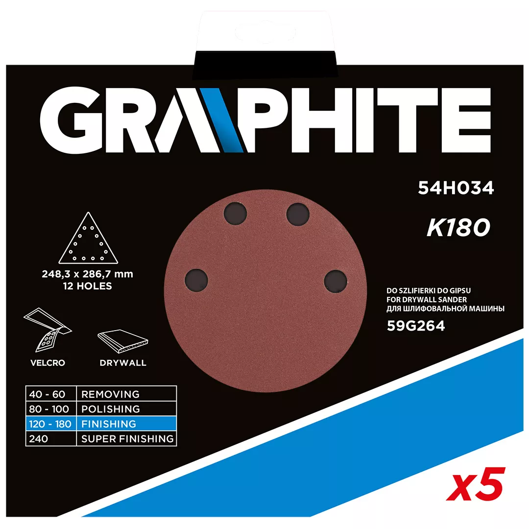 Papier ścierny na rzep K180, trójkątny z otworami, 5 szt., do szlifierki 59G264, 54H034 marki GRAPHITE o gradacji K180. Opakowanie zawiera pięć trójkątnych sztuk arkuszy, przeznaczonych do szlifierki do gipsu 59G264 GRAPHITE. Akcesoria posiadają praktyczne otwory. Papier ścierny na rzep wykonany został z materiału typu E. Charakteryzuje się półotwartym nasypem i ziarnem wykonanym z elektrokorundu. Będzie odpowiedni zarówno do zastosowań profesjonalnych jak i podczas różnych zadań majsterkowicza.
