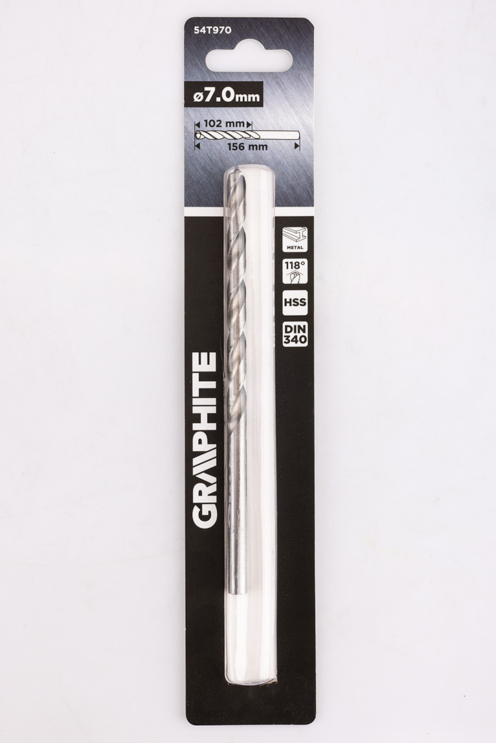 Wiertło do metalu HSS, DIN 340, 7 mm, 54T970 marki GRAPHITE to wiertło do metalu, charakteryzujące się średnicą 7 mm, długością całkowitą 156 mm oraz długością części roboczej 102 mm. Wykonane zostało ze stali szybkotnącej HSS. Posiada uchwyt cylindryczny oraz kąt zaostrzenia wiertła 118°. Cechuje się zgodnością z normą DIN 340 i jest odpowiednie dla każdego majsterkowicza.