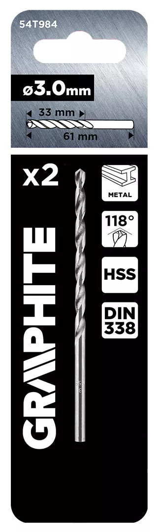 Wiertła do metalu HSS, 3.0 mm, 2 szt. 54T984 marki GRAPHITE to zestaw 2 sztuk wierteł przeznaczonych do pracy z metalem. Pojedynczy element charakteryzuje się średnicą 3 mm, długością całkowitą 61 mm oraz długością roboczą 33 mm. Kąt wierzchołka wiertła GRAPHITE wynosi 118 stopni. Narzędzia posiadają zgodność z normą DIN 338. Przydadzą się w zastosowaniach amatorskich.