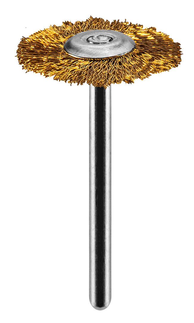 Szczotki druciane, pędzelkowa: średnica 5 mm, średnica trzpienia 3.2 mm, kielichowa: średnica 15 mm, średnica trzpienia 3.2 mm, talerzowa: średnica 22 mm, średnica trzpienia 3.2 mm, drut stalowy, mosiądzowany, karbowany, komplet 3 sztuk, do polerowania, zastosowanie: metal, drewno, ceramika, szkło, tworzywo sztuczne