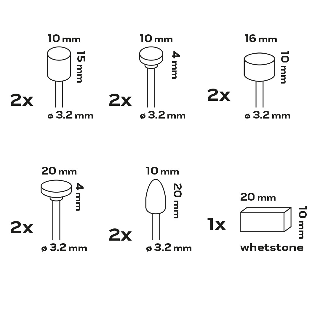 Akcesoria do miniszlifierki, kamienie szlifierskie: 2x pocisk: średnica 10 mm, wysokość robocza 20 mm, średnica trzpienia 3.2 mm, 2x walec: średnica 10 mm, wysokość robocza 15 mm, średnica trzpienia 3.2 mm, 2x walec: średnica 16 mm, wysokość robocza 10 mm, średnica trzpienia 3.2 mm, 2x pastylka: średnica 10 mm, wysokość robocza 4 mm, średnica trzpienia 3.2 mm, 2x pastylka: średnica 20 mm, wysokość robocza 4 mm, średnica trzpienia 3.2 mm, osełka 20 x 10 mm, do szlifowania, zestaw 11 elementów, zastosowanie: metal, drewno, ceramika, szkło, tworzywo sztuczne