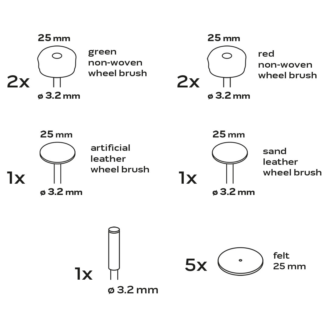 Akcesoria do miniszlifierki, szczotki polerskie: 2x zielona szczotka polerska, średnica 25 mm, średnica trzpienia 3.2 mm, 2x czerwona szczotka polerska, średnica 25 mm, średnica trzpienia 3.2 mm, szczotka polerska ze sztucznej skóry, średnica 25 mm, średnica trzpienia 3.2 mm, szczotka polerska z piaskowanej skóry, średnica 25 mm, średnica trzpienia 3.2 mm, 5x krążek filcowy, średnica 25 mm, trzpień do krążków filcowych, średnica 3.2 mm, zestaw 12 elementów, zastosowanie: metal, drewno, ceramika, szkło, tworzywo sztuczne