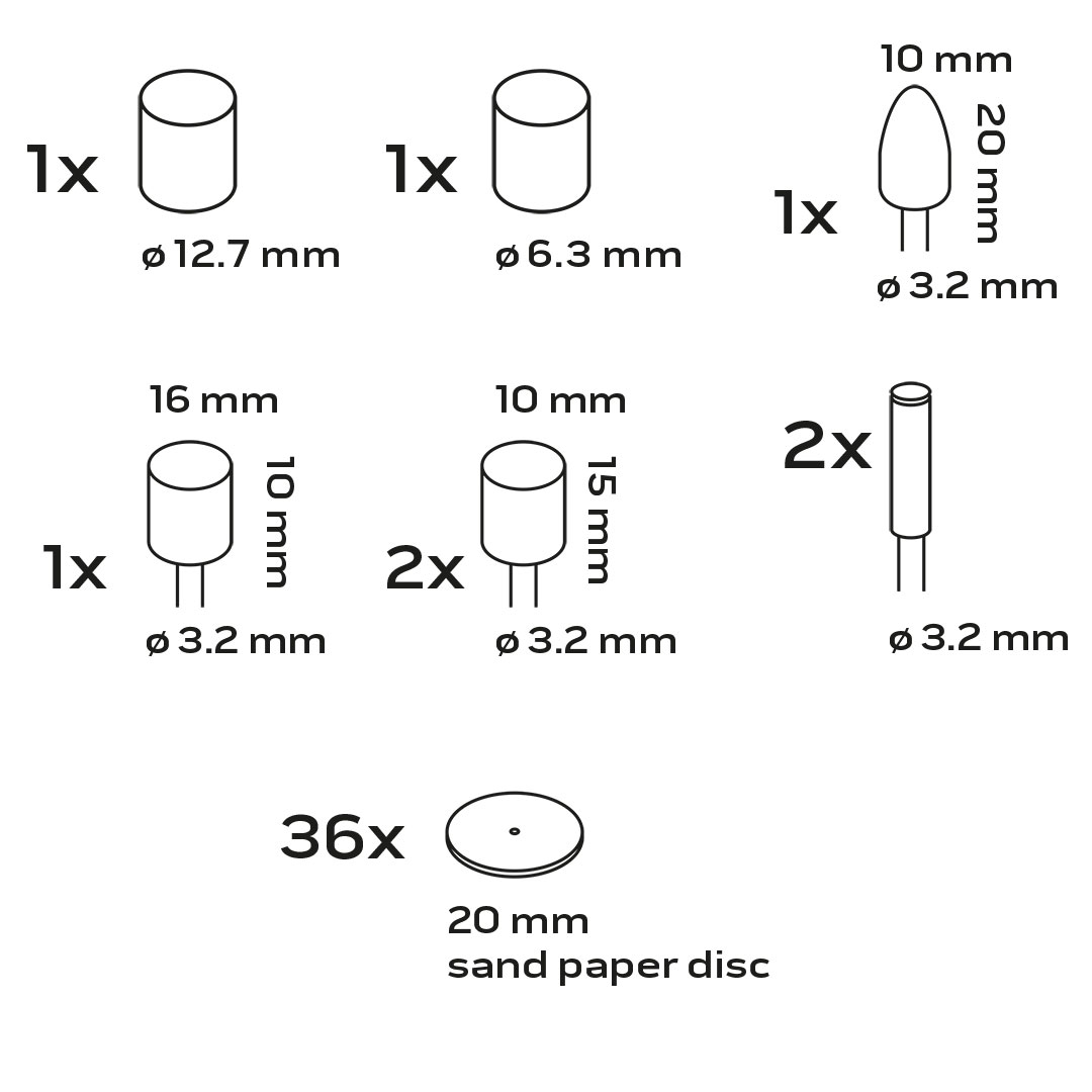 Akcesoria do miniszlifierki, 8x taśmy szlifierskie z tlenku glinu: 4x średnica 6.3 mm, P120, 4x średnica 12 mm, P60, 2x bęben szlifierski: 1x średnica 12.7 mm, 1x średnica 6.3 mm, 4x kamień szlifierski: 1x pocisk: średnica 10 mm, wysokość robocza 20 mm, średnica trzepienia 3.2 mm, 1x walec: średnica 16 mm, wyskość robocza 10 mm, średnica trzpienia 3.2 mm, 2x walec średnica 10 mm, wysokość robocza 15 mm, średnica trzpienia 3.2 mm, 36x krążki szlifierskie, średnica 20 mm, 2x trzpień o średnicy 3.2 mm, maksymalna prędkość obrotowa 22 000 obr/min., zestaw 52 elementów, zastosowanie: metal, drewno, ceramika, szkło, tworzywo sztuczne