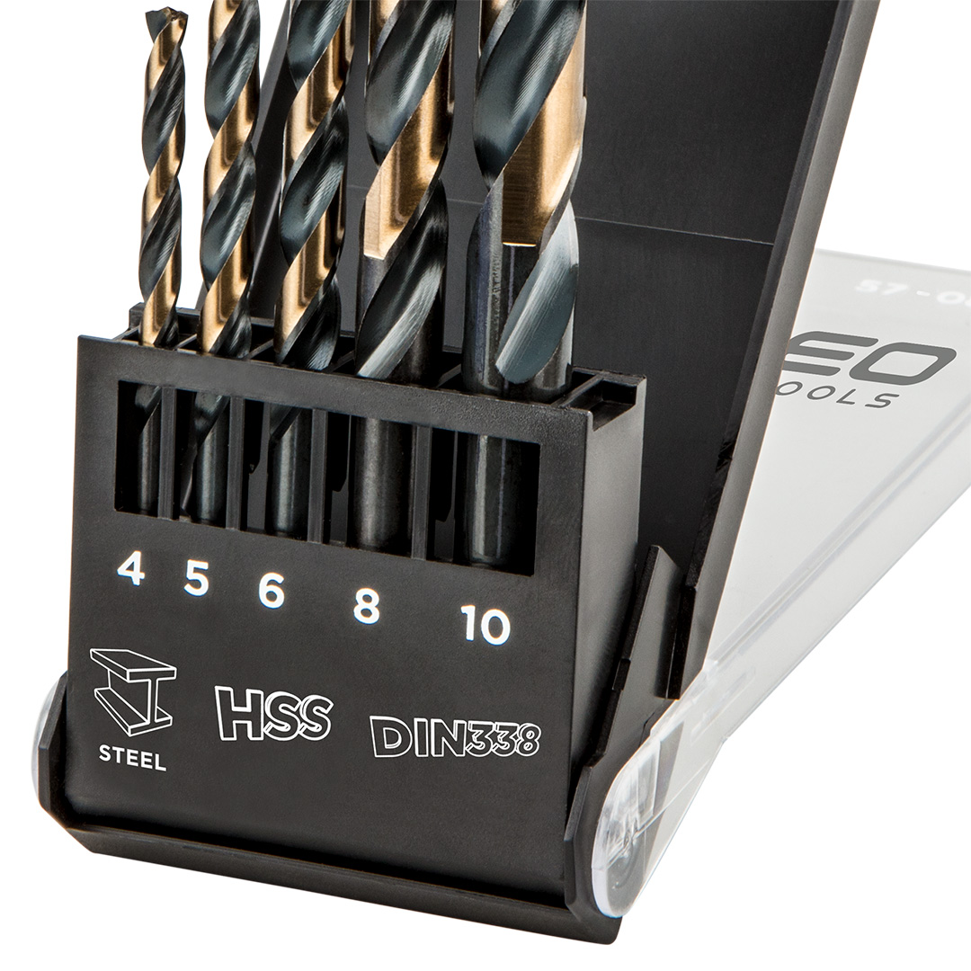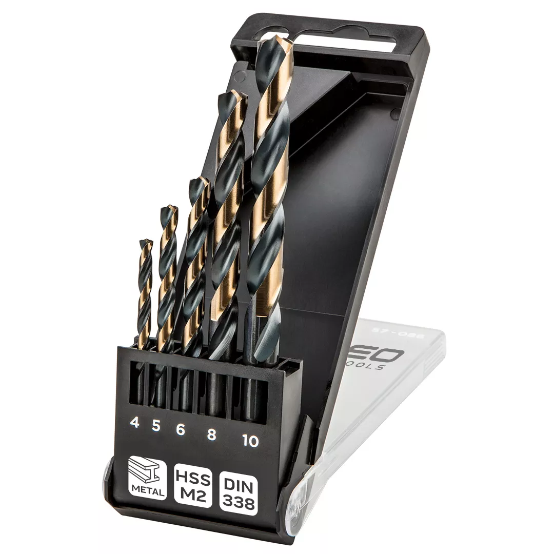 Wiertła do metalu HSS-CNC, średnice 4, 5, 6, 8, 10 mm, głęboko szlifowane, materiał wykonania stal M2, kąt wierzchołkowy 124°, korekcja ścinu E, DIN338, długość części roboczej 4: 43 mm, 5: 52 mm, 6: 57 mm, 8: 75 mm, 10: 87 mm, długość cakowita 4: 75 mm, 5: 86 mm, 6: 93 mm, 8: 117 mm, 10: 133 mm, maksymalna prędkość obrotowa 4: 1800 obr/min., 5: 1500 obr/min., 6: 1300 obr/min., 8: 1000 obr/min., 10: 800 obr/min., zestaw 5 sztuk