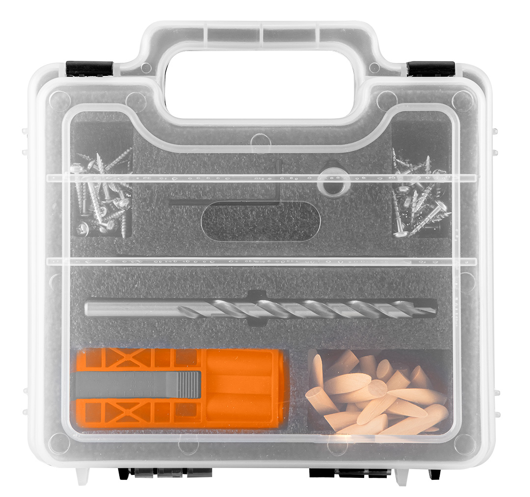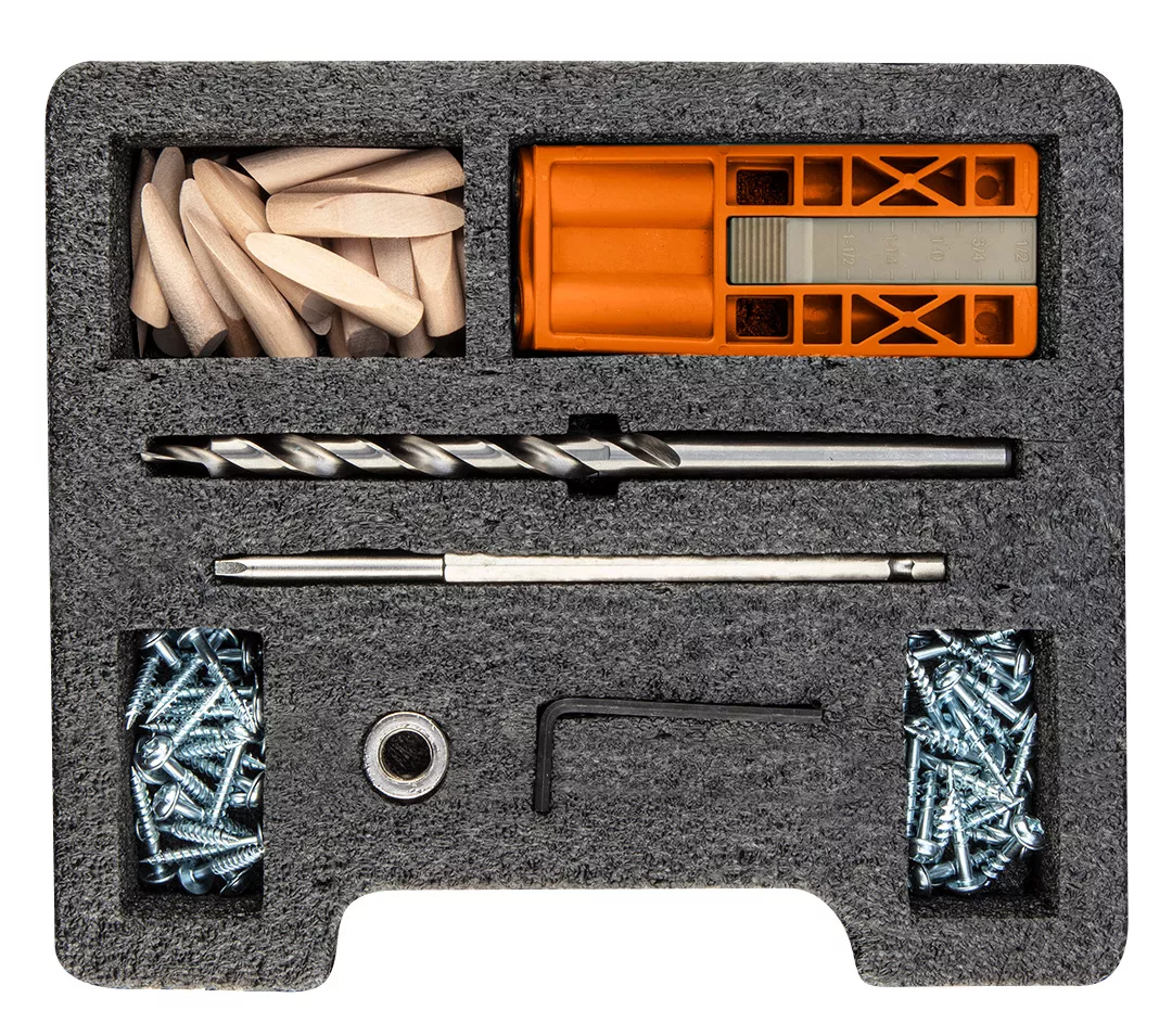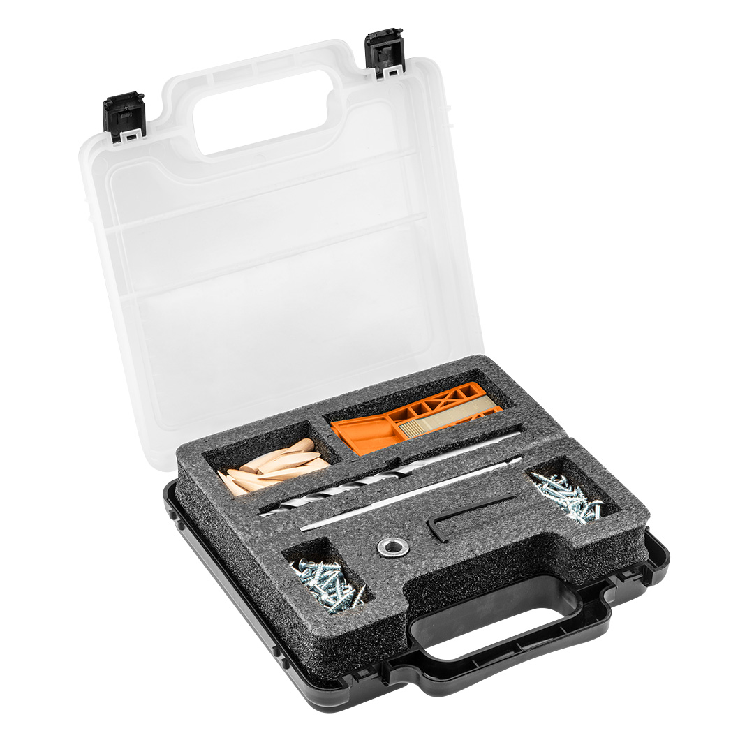 Zestaw do połączeń niewidocznych, 76 elementów, 48 szt. Wkrętów do drewna, klucz sześciokątny o średnicy 3 mm i długości 60 mm, 24 szt. kołków do drewna, wiertło do drewna o średnicy 9.5 mm i długości całkowitej 180 mm, połączenia narożnikowe, typu "T", czołowe, ukośne,