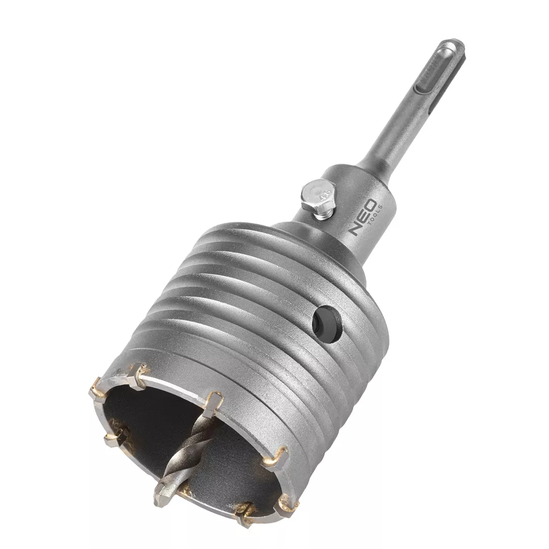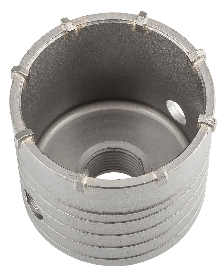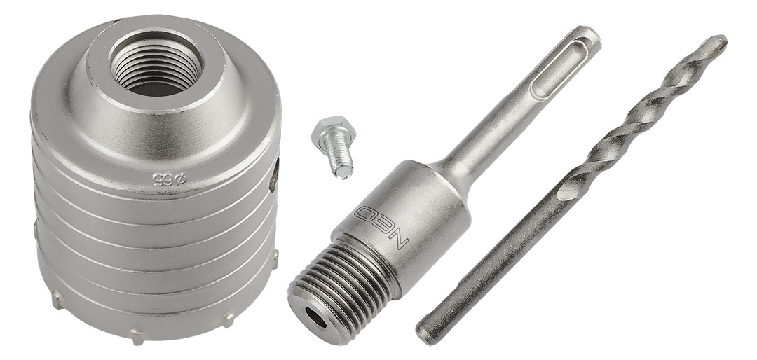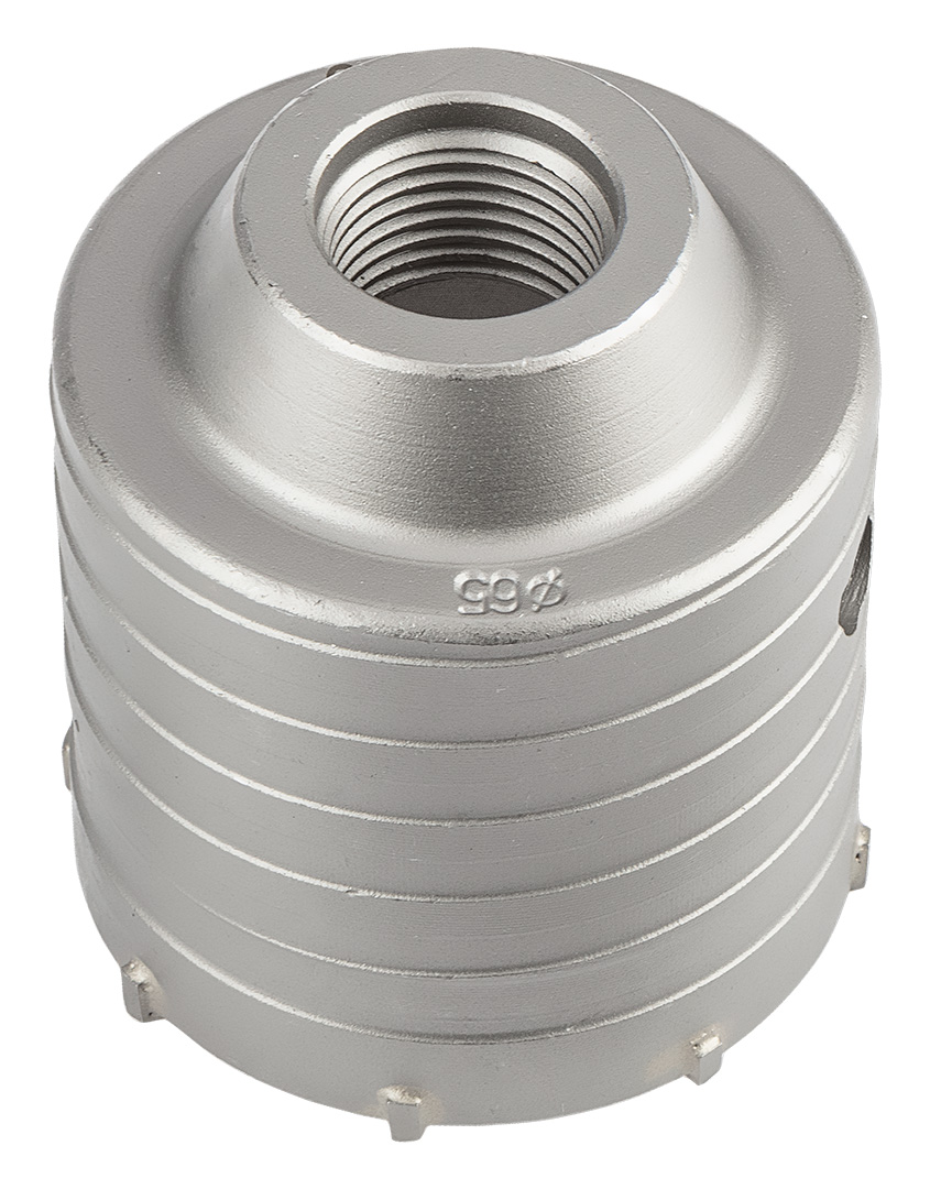 Otwornica widiowa z adapterem SDS+ oraz wiertłem pilotującym, średnica otwornicy 65 mm, wysokość otwornicy 72 mm, maksymalna głębokość wiercenia 50 mm, ilość widii 8 szt., szerokość widii 2,2 mm, średnica wewnętrzna 59 mm, średnica wiertła 8 mm, długość wiertła 110 mm, całkowita długość zestawu 180 mm, materiał ostrzy: TCT, gwint M22, do pracy z udarem, zastosowanie: beton
