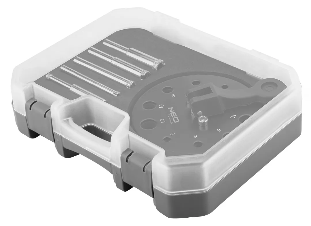 Wiertła diamentowe 5, 6, 8, 10, 12 mm, prowadnica z przyssawką z 10 otworami o średnicach: 2x 5, 2x 6, 2x 8, 2x 10, 2x 12 mm, do pracy na mokro, nasyp diamentowy, maksymalna głębokość wiercenia 35 mm, maksymalna prędkość obrotowa 2 500 obr/min, zastosowanie: marmur, ceramika, gres, szkło, zestaw 6 elementów