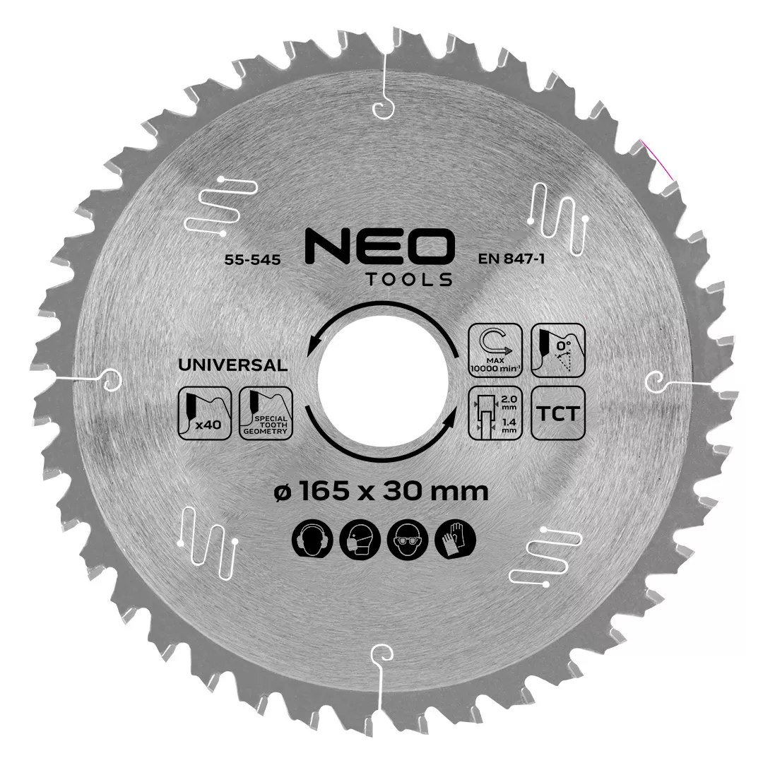 Tarcza do pilarki, widiowa, 165 x 30 mm, 40 zębów, uniwersalna 55-545 marki NEO TOOLS wyposażona została w 40 zębów o wymiarach 2 mm x 1,4 mm, wykonanych z węglika spiekanego TCT. Ząb FWF, o specjalnej geometrii oraz szerokiej części grzebieniowej, gwarantuje zwiększoną wytrzymałość na obciążenia. Tarcza marki NEO TOOLS ze stali manganowej MN65 osiąga maksymalną prędkość obrotową do 10 000 obr./min. W zestawie znajdują się trzy pierścienie, umożliwiające redukcje do wymiarów: 30 x 25,4 mm, 30 x 20 mm i 30 x 16 mm. Tarcza NEO TOOLS przeznaczona jest do cięcia profili stalowych, aluminiowych oraz innych metali kolorowych (takich jak miedź), a także tworzyw sztucznych, drewna z małymi gwoździami, płyt OSB, sklejek, gałęzi i laminatów. Zastosowanie nacięć kompensacyjnych zmniejsza poziom hałasu, a szczeliny zwiększają stabilność narzędzia oraz dokładność cięcia. Produkt od marki NEO TOOLS zapewnia czystą i precyzyjną pracę.