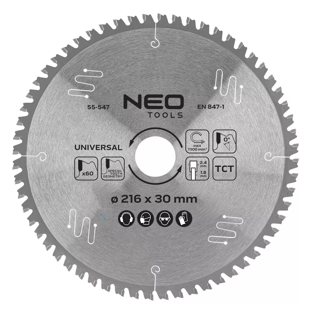 Tarcza do pilarki, widiowa, 216 x 30 mm, 60 zębów, uniwersalna 55-547 marki NEO TOOLS wyposażona została w 60 zębów o wymiarach 2,4 mm x 1,8 mm, wykonanych z węglika spiekanego TCT. Ząb FWF, o specjalnej geometrii oraz szerokiej części grzebieniowej, gwarantuje zwiększoną wytrzymałość na obciążenia. Tarcza marki NEO TOOLS ze stali manganowej MN65 osiąga maksymalną prędkość obrotową do 7 300 obr./min. W zestawie znajdują się trzy pierścienie, umożliwiające redukcje do wymiarów: 30 x 25,4 mm, 30 x 20 mm i 30 x 16 mm. Tarcza NEO TOOLS przeznaczona jest do cięcia profili stalowych, aluminiowych oraz innych metali kolorowych (takich jak miedź), a także tworzyw sztucznych, drewna z małymi gwoździami, płyt OSB, sklejek, gałęzi i laminatów. Zastosowanie nacięć kompensacyjnych zmniejsza poziom hałasu, a szczeliny zwiększają stabilność narzędzia oraz dokładność cięcia. Produkt od marki NEO TOOLS zapewnia czystą i precyzyjną pracę.