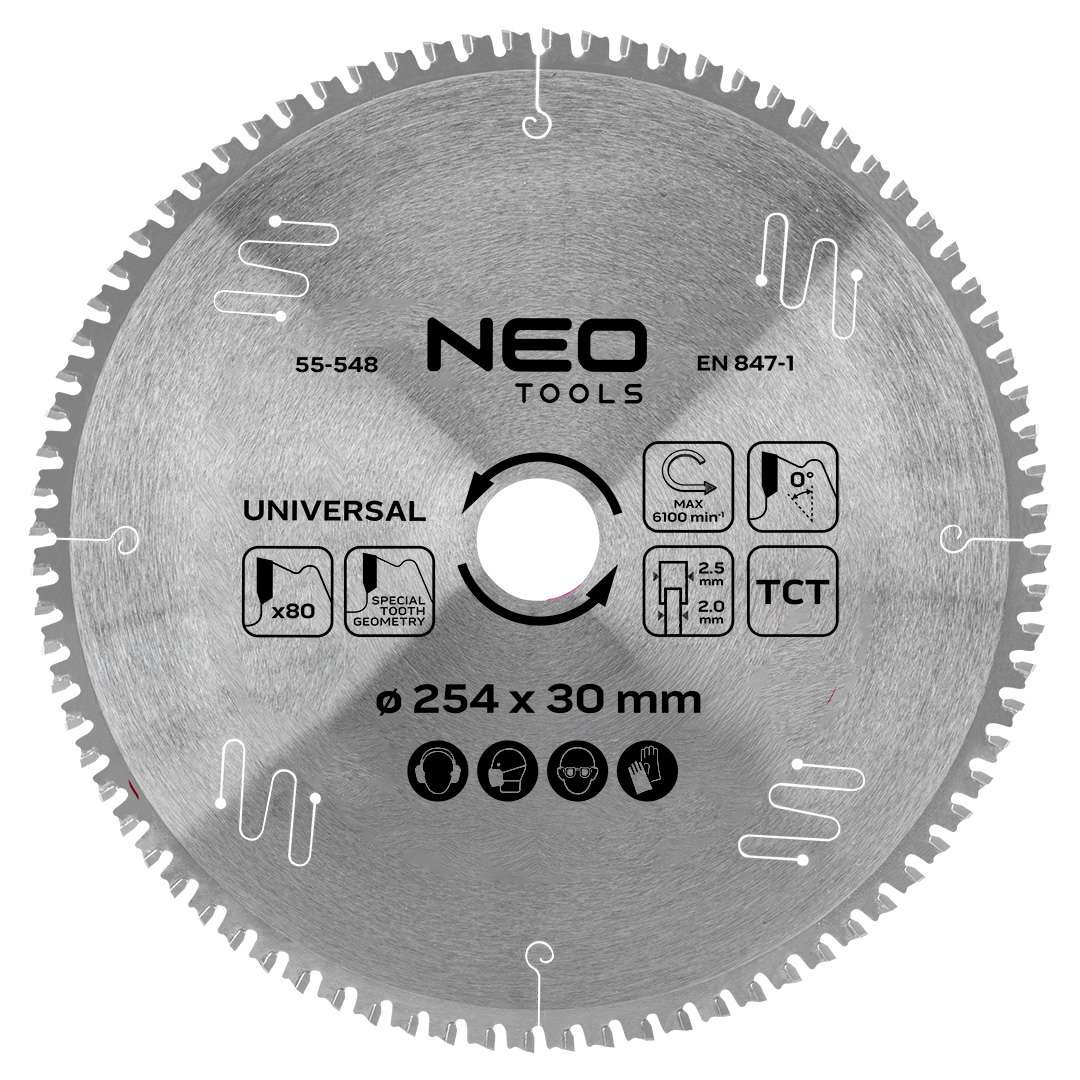 Tarcza do pilarki, widiowa, 254 x 30 mm, 80 zębów, uniwersalna 55-548 marki NEO TOOLS wyposażona została w 80 zębów o wymiarach 2,5 mm x 2 mm, wykonanych z węglika spiekanego TCT. Ząb FWF, o specjalnej geometrii oraz szerokiej części grzebieniowej, gwarantuje zwiększoną wytrzymałość na obciążenia. Tarcza marki NEO TOOLS ze stali manganowej MN65 osiąga maksymalną prędkość obrotową do 6 100 obr./min. W zestawie znajdują się trzy pierścienie, umożliwiające redukcje do wymiarów: 30 x 25,4 mm, 30 x 20 mm i 30 x 16 mm. Tarcza NEO TOOLS przeznaczona jest do cięcia profili stalowych, aluminiowych oraz innych metali kolorowych (takich jak miedź), a także tworzyw sztucznych, drewna z małymi gwoździami, płyt OSB, sklejek, gałęzi i laminatów. Zastosowanie nacięć kompensacyjnych zmniejsza poziom hałasu, a szczeliny zwiększają stabilność narzędzia oraz dokładność cięcia. Produkt od marki NEO TOOLS zapewnia czystą i precyzyjną pracę.