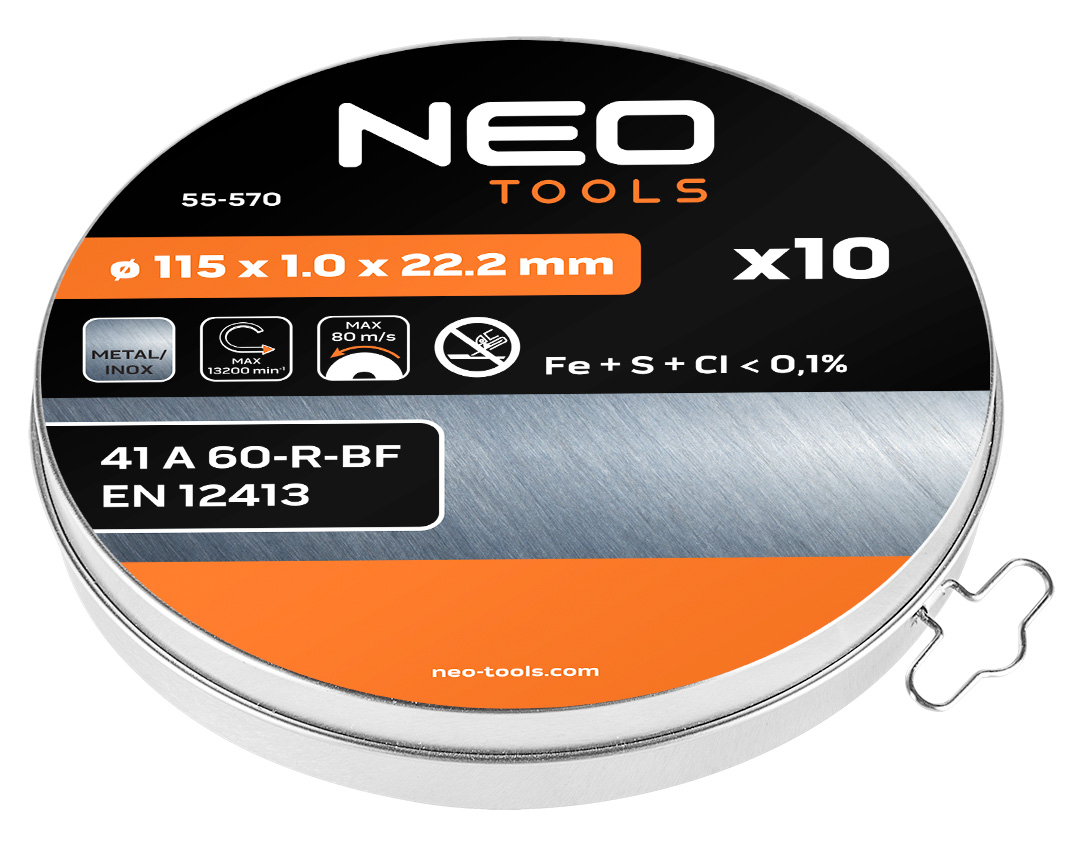 Tarcze tnące do metalu 115 x 1,0 x 22,2 mm, 41 A60-R-BF, INOX, 10 sztuk 55-570 marki NEO TOOLS składa się na 10 sztuk tarcz do metalu/INOX o parametrach 115 x 1 x 22,2 mm. Charakteryzuje się maksymalną prędkością obrotową 13 200 obr./min oraz maksymalną prędkością obwodową – 80 m/s. Dzięki zaawansowanej konstrukcji i redukcji grubości pozwala znacząco skrócić czas pracy. Zapewnia wysoki poziom bezpieczeństwa dzięki zgodności z normą EN12313. Tarcza marki NEO TOOLS polecana jest profesjonalistom i majsterkowiczom.