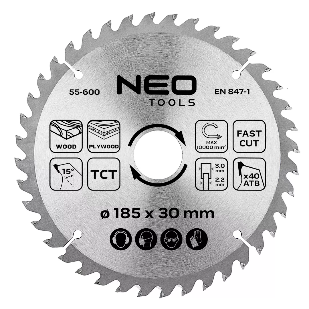 Tarcza do pilarki, widiowa, 185 x 30 mm, 40 zębów 55-600 marki NEO TOOLS wyposażona została w 40 zębów o wymiarach 3 mm x 2,2 mm, wykonanych z węglika spiekanego TCT. Tarcza ze stali manganowej MN65 osiąga maksymalną prędkość obrotową do 10 000 obr./min. W zestawie znajdują się trzy pierścienie, umożliwiające redukcje do wymiarów: 30 x 25,4 mm, 30 x 20 mm i 30 x 16 mm. Tarcza NEO TOOLS przeznaczona jest do cięcia drewna, materiałów drewnopochodnych, płyt wiórowych, sklejek, MDF, gałęzi i laminatów. Produkt zapewnia czystą i precyzyjną pracę.