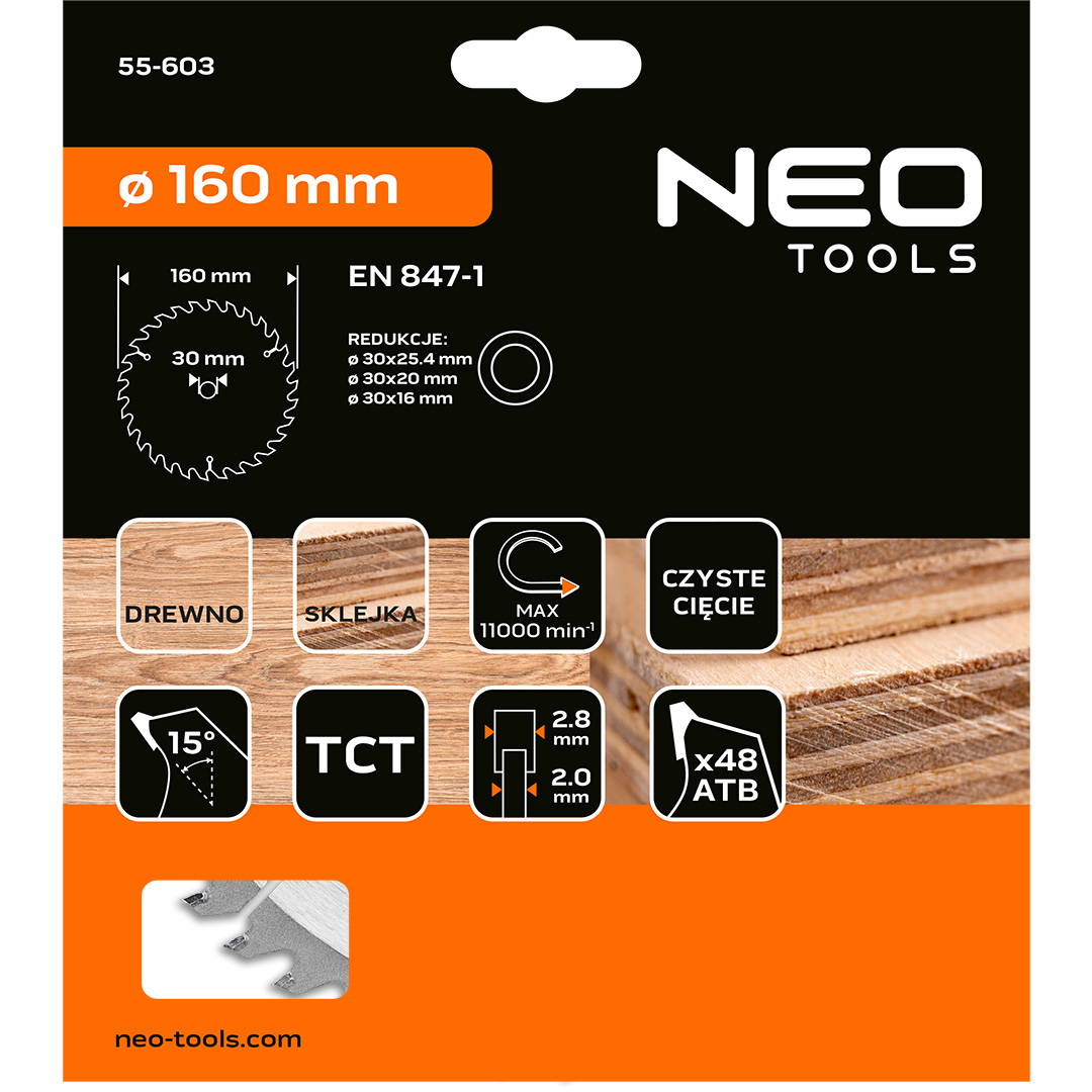 Tarcza do pilarki, widiowa, 160 x 30 mm, 48 zębów 55-603 marki NEO TOOLS wyposażona została w 48 zębów o wymiarach 2,8 mm x 2 mm, wykonanych z węglika spiekanego TCT. Tarcza ze stali manganowej MN65 osiąga maksymalną prędkość obrotową do 11 000 obr./min. W zestawie znajdują się trzy pierścienie, umożliwiające redukcje do wymiarów: 30 x 25,4 mm, 30 x 20 mm i 30 x 16 mm. Tarcza NEO TOOLS przeznaczona jest do cięcia drewna, materiałów drewnopochodnych, płyt wiórowych, sklejek, MDF, gałęzi i laminatów. Produkt zapewnia czystą i precyzyjną pracę.