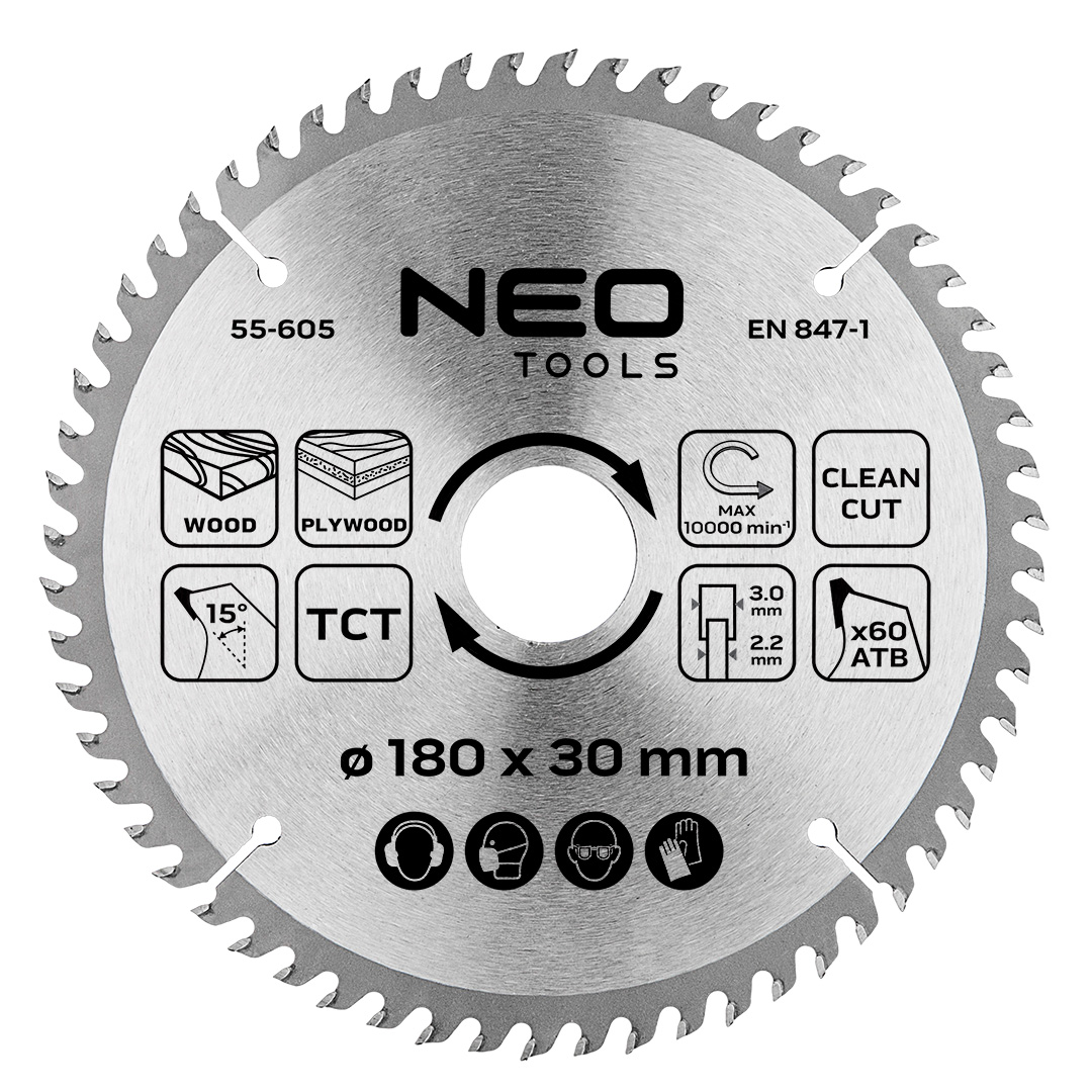 Tarcza do pilarki, widiowa, 180 x 30 mm, 60 zębów 55-605 marki NEO TOOLS wyposażona została w 60 zębów o wymiarach 3 mm x 2,2 mm, wykonanych z węglika spiekanego TCT. Tarcza ze stali manganowej MN65 osiąga maksymalną prędkość obrotową do 10 000 obr./min. W zestawie znajdują się trzy pierścienie, umożliwiające redukcje do wymiarów: 30 x 25,4 mm, 30 x 20 mm i 30 x 16 mm. Tarcza NEO TOOLS przeznaczona jest do cięcia drewna, materiałów drewnopochodnych, płyt wiórowych, sklejek, MDF, gałęzi i laminatów. Produkt zapewnia czystą i precyzyjną pracę.