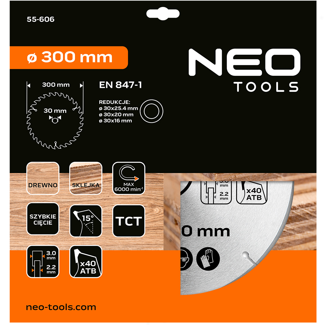 Tarcza do pilarki, widiowa, 300 x 30 mm, 40 zębów 55-606 marki NEO TOOLS wyposażona została w 40 zębów o wymiarach 3 mm x 2,2 mm, wykonanych z węglika spiekanego TCT. Tarcza ze stali manganowej MN65 osiąga maksymalną prędkość obrotową do 6 000 obr./min. W zestawie znajdują się trzy pierścienie, umożliwiające redukcje do wymiarów: 30 x 25,4 mm, 30 x 20 mm i 30 x 16 mm. Tarcza NEO TOOLS przeznaczona jest do cięcia drewna, materiałów drewnopochodnych, płyt wiórowych, sklejek, MDF, gałęzi i laminatów. Produkt zapewnia czystą i precyzyjną pracę.