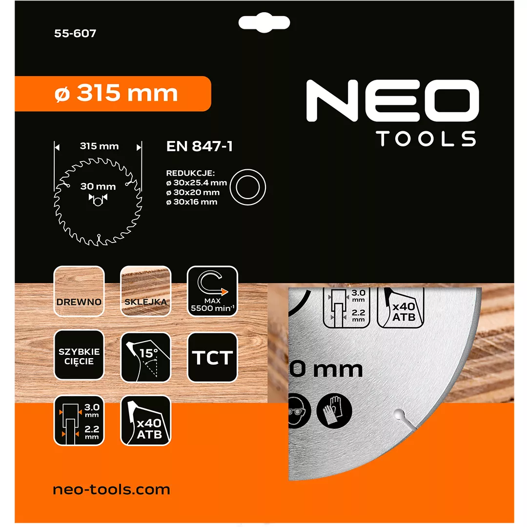 Tarcza do pilarki, widiowa, 315 x 30 mm, 40 zębów 55-607 marki NEO TOOLS wyposażona została w 40 zębów o wymiarach 3 mm x 2,2 mm, wykonanych z węglika spiekanego TCT. Tarcza ze stali manganowej MN65 osiąga maksymalną prędkość obrotową do 5 500 obr./min. W zestawie znajdują się trzy pierścienie, umożliwiające redukcje do wymiarów: 30 x 25,4 mm, 30 x 20 mm i 30 x 16 mm. Tarcza NEO TOOLS przeznaczona jest do cięcia drewna, materiałów drewnopochodnych, płyt wiórowych, sklejek, MDF, gałęzi i laminatów. Produkt zapewnia czystą i precyzyjną pracę.