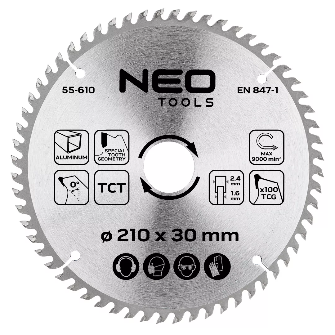 Tarcza do pilarki, widiowa, 210 x 30 mm, 100 zębów, do aluminium 55-610 marki NEO TOOLS wyposażona została w 100 zębów o wymiarach 2,4 mm x 1,6 mm, wykonanych z węglika spiekanego TCT. Ząb TCG, o specjalnej geometrii i szerokiej części grzebieniowej, gwarantuje zwiększoną wytrzymałość na obciążenia. Tarcza marki NEO TOOLS ze stali manganowej MN65 osiąga maksymalną prędkość obrotową do 9 000 obr./min. W zestawie znajdują się trzy pierścienie, umożliwiające redukcje do wymiarów: 30 x 25,4 mm, 30 x 20 mm i 30 x 16 mm. Tarcza NEO TOOLS przeznaczona jest do cięcia profili aluminiowych oraz innych metali kolorowych. Narzędzie zapewnia czystą i precyzyjną pracę.