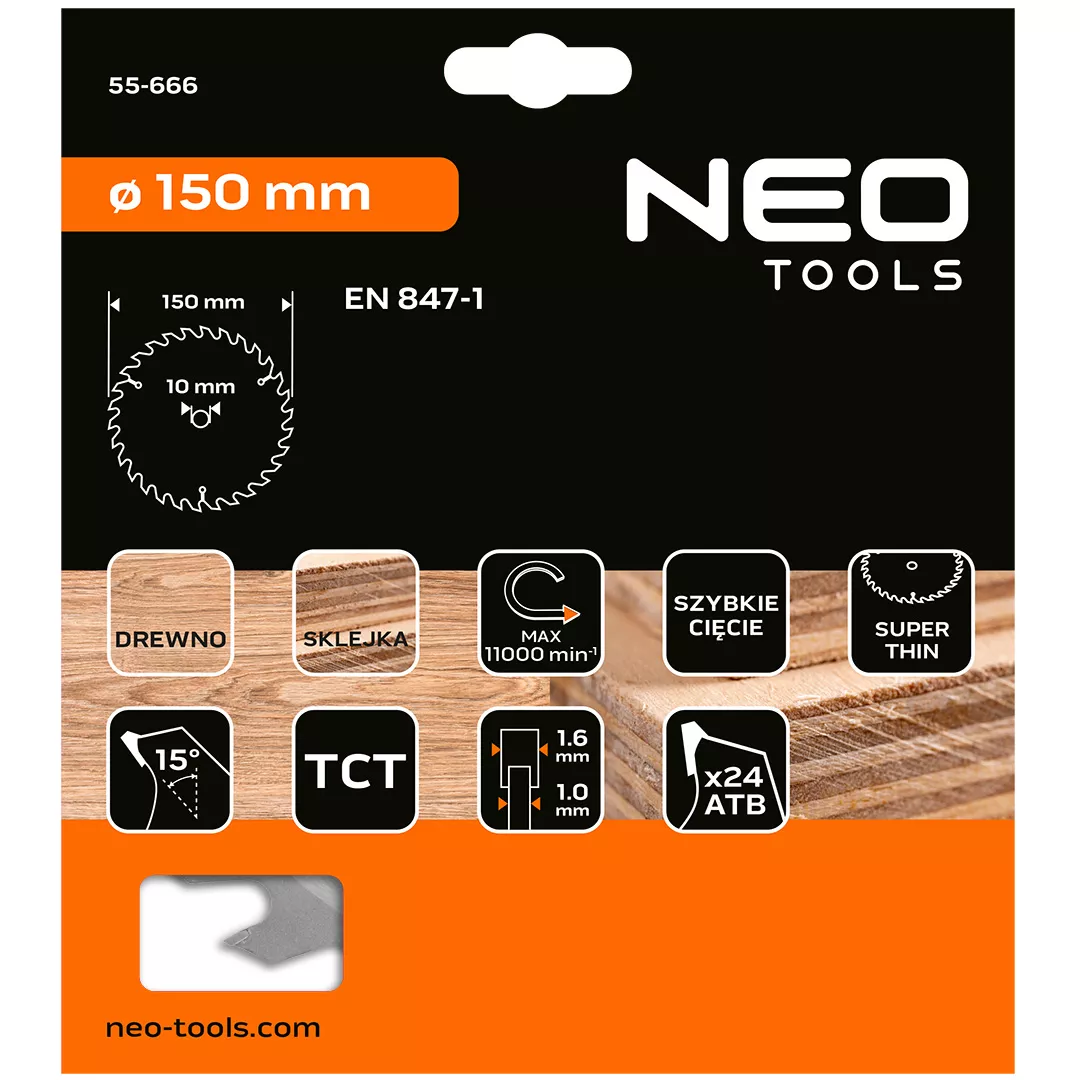 Tarcza do pilarki, widiowa 150 x 10 mm, 1,6 mm , 24 zęby, Energy+ 55-666 marki NEO TOOLS to narzędzie przeznaczone do cięcia drewna i materiałów drewnopochodnych, takich jak: sklejka, płyta wiórowa oraz MDF. Wykonana ze stali manganowej MN65, wyposażona w 24 zęby z TCT (węglika spiekanego), gwarantuje szybkie oraz czyste cięcie. Tarcza od marki NEO TOOLS ma średnicę 150 mm, otwór montażowy 10 mm, a jej ząb charakteryzuje się wymiarami 1,6 mm x 1,0 mm. Dzięki supercienkiej konstrukcji cechuje się mniejszym oporem podczas pracy, co też przekłada się na większą wydajność urządzeń akumulatorowych. Maksymalna prędkość obrotowa wynosi 11 000 obr./min, czyniąc ją idealnym wyborem do lekkich pilarek z linii Energy+.