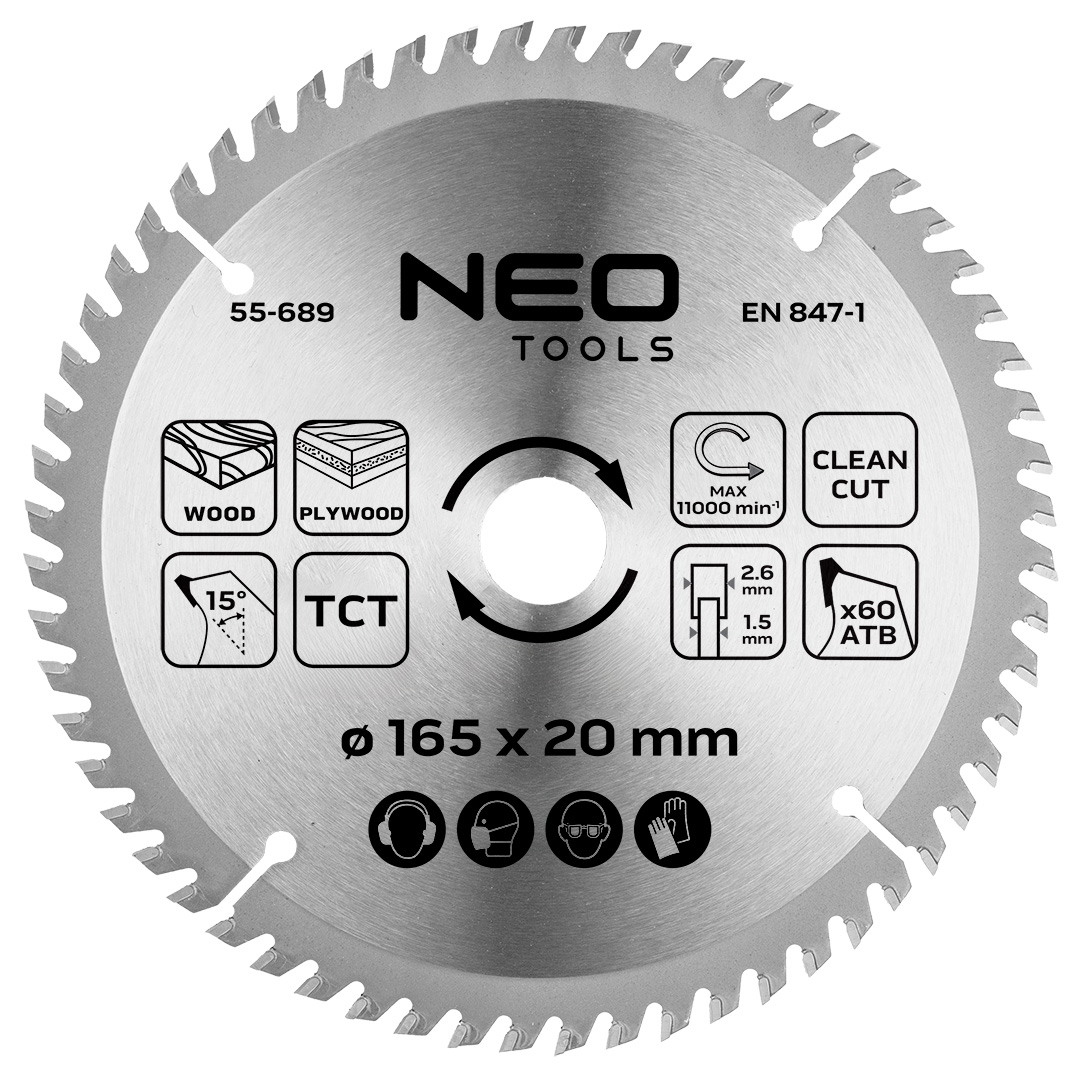 Tarcza do pilarki, zagłębiarki, widiowa, 165 x 20 mm, 60 zębów 55-689 marki NEO TOOLS to tarcza o średnicy 165 mm i otworze montażowym 20 mm (w zestawie redukcja 20 x 16 mm), która przeznaczona jest do precyzyjnego cięcia drewna i materiałów drewnopochodnych - takich jak sklejka, płyta wiórowa czy MDF. Wyposażona została w 60 zębów wykonanych z węglika spiekanego (TCT) o wymiarach 2,6 mm x 1,5 mm. Specjalna geometria zębów ATB (naprzemianległe) zapewnia dokładne, czyste cięcie. Tarcza widiowa marki NEO TOOLS wykonana została ze stali manganowej MN65. Jej maksymalna prędkość obrotowa wynosi 11 000 obr./min. Sprawdzi się w zadaniach profesjonalistów jak i majsterkowiczów.