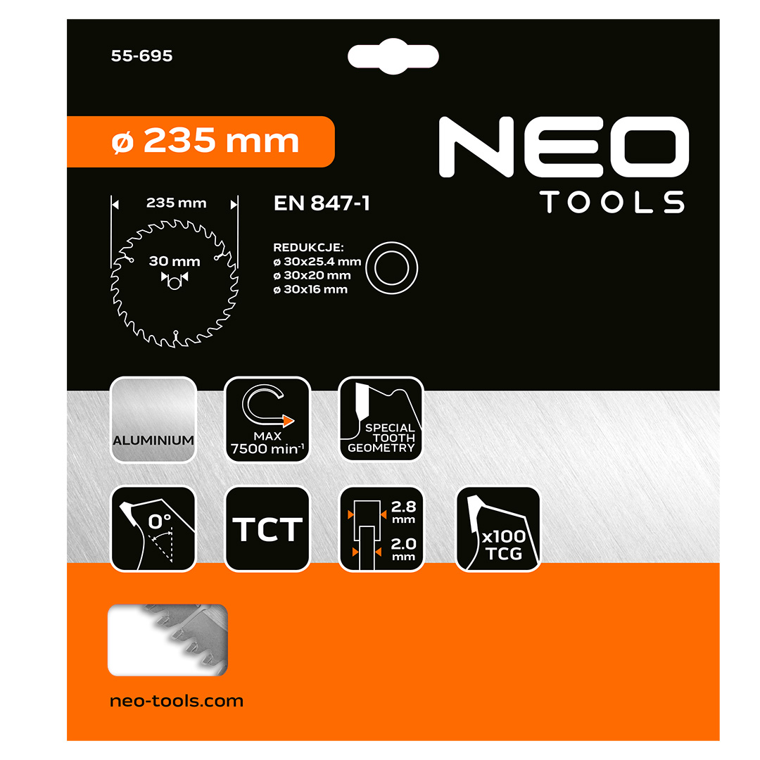 Tarcza do pilarki, widiowa, 235 x 30 mm, 100 zębów, do aluminium 55-695 marki NEO TOOLS wyposażona została w 100 zębów o wymiarach 2,8 mm x 2 mm, wykonanych z węglika spiekanego TCT. Ząb TCG, o specjalnej geometrii i szerokiej części grzebieniowej, gwarantuje zwiększoną wytrzymałość na obciążenia. Tarcza marki NEO TOOLS ze stali manganowej MN65 osiąga maksymalną prędkość obrotową do 7 500 obr./min. W zestawie znajdują się trzy pierścienie, umożliwiające redukcje do wymiarów: 30 x 25,4 mm, 30 x 20 mm i 30 x 16 mm. Tarcza NEO TOOLS przeznaczona jest do cięcia profili aluminiowych oraz innych metali kolorowych. Narzędzie zapewnia czystą i precyzyjną pracę.