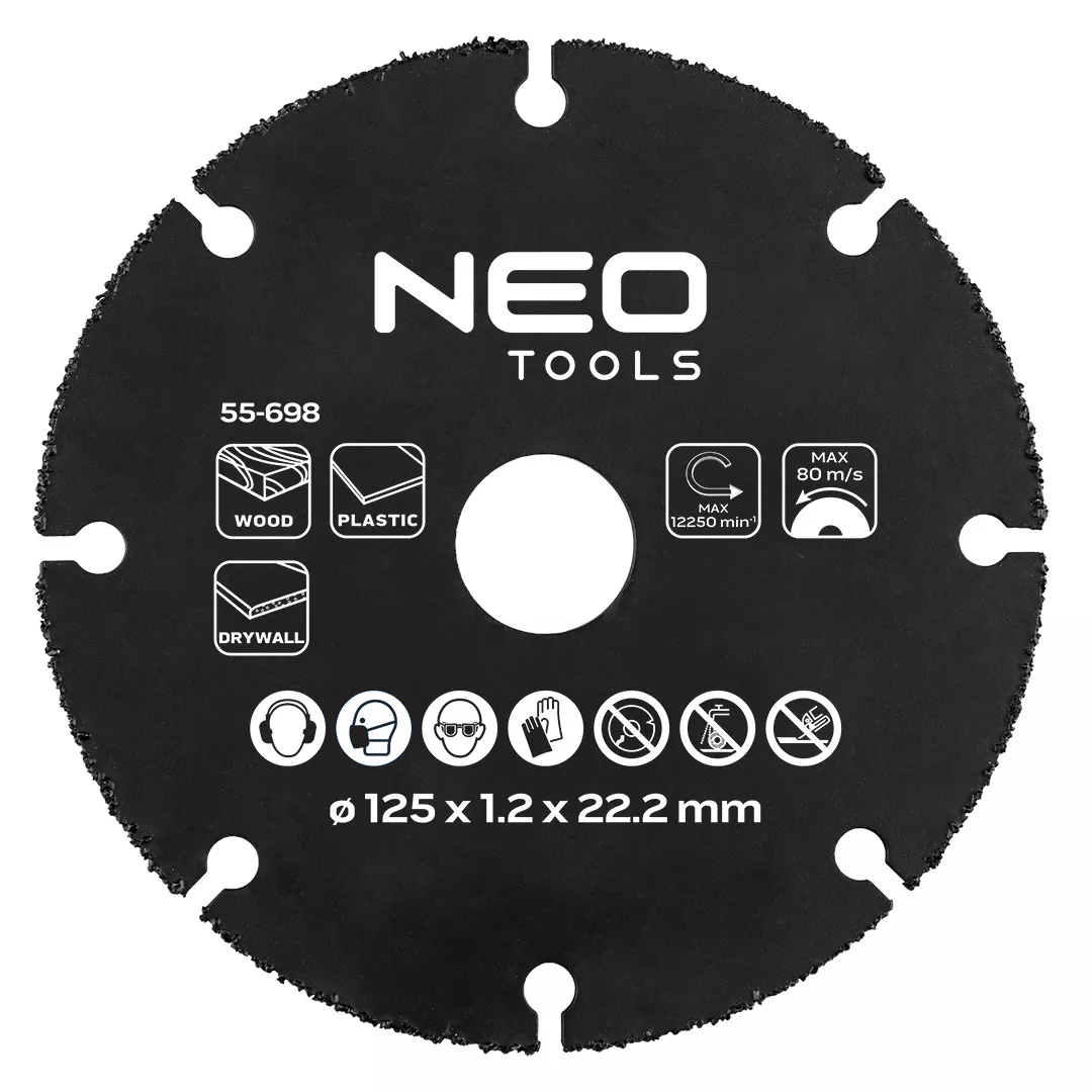 Tarcza tnąca do materiałów miękkich, średnica 125 mm, grubość 1.2 mm, średnica otworu montażowego 22.2 mm, na szlifierke kątową, nasyp z węglika wolframu, do materiałów sztucznych, drewna, płyt karton-gibsowych, max prędkość obrotowa 12 250 obr/min., max 80 m/s